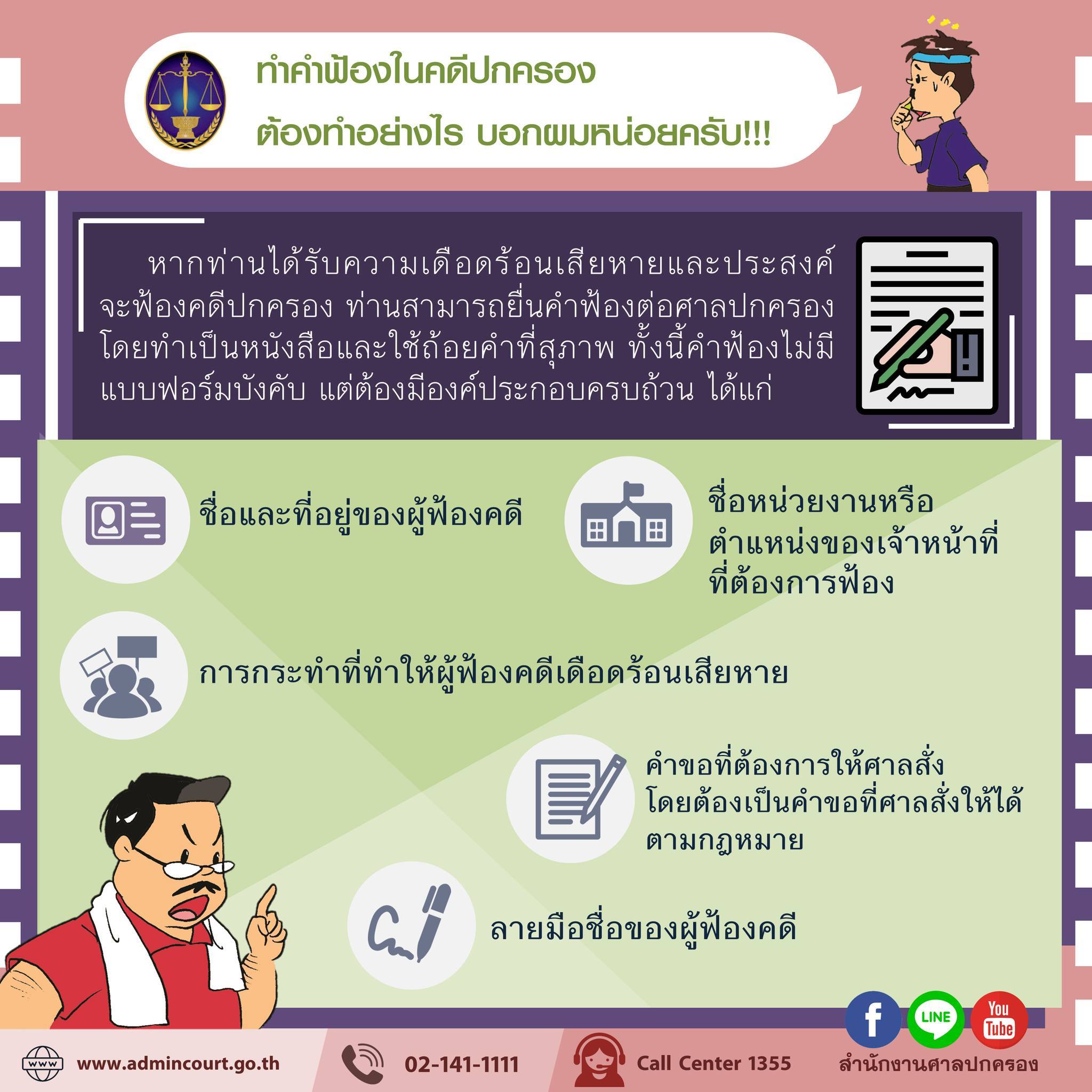 รู้หรือไม่ กับลุงเป็นธรรม องค์ประกอบของการเขียนคำฟ้องคดีต่อศาลปกครองมีอะไรบ้าง และสามารถยื่นคำฟ้องที่ช่องทางใดได้บ้าง ปรึกษาข้อกฎหมายคดีปกครองได้ที่ สายด่วนศาลปกครอง 1355 (ในวันและเวลาราชการ)