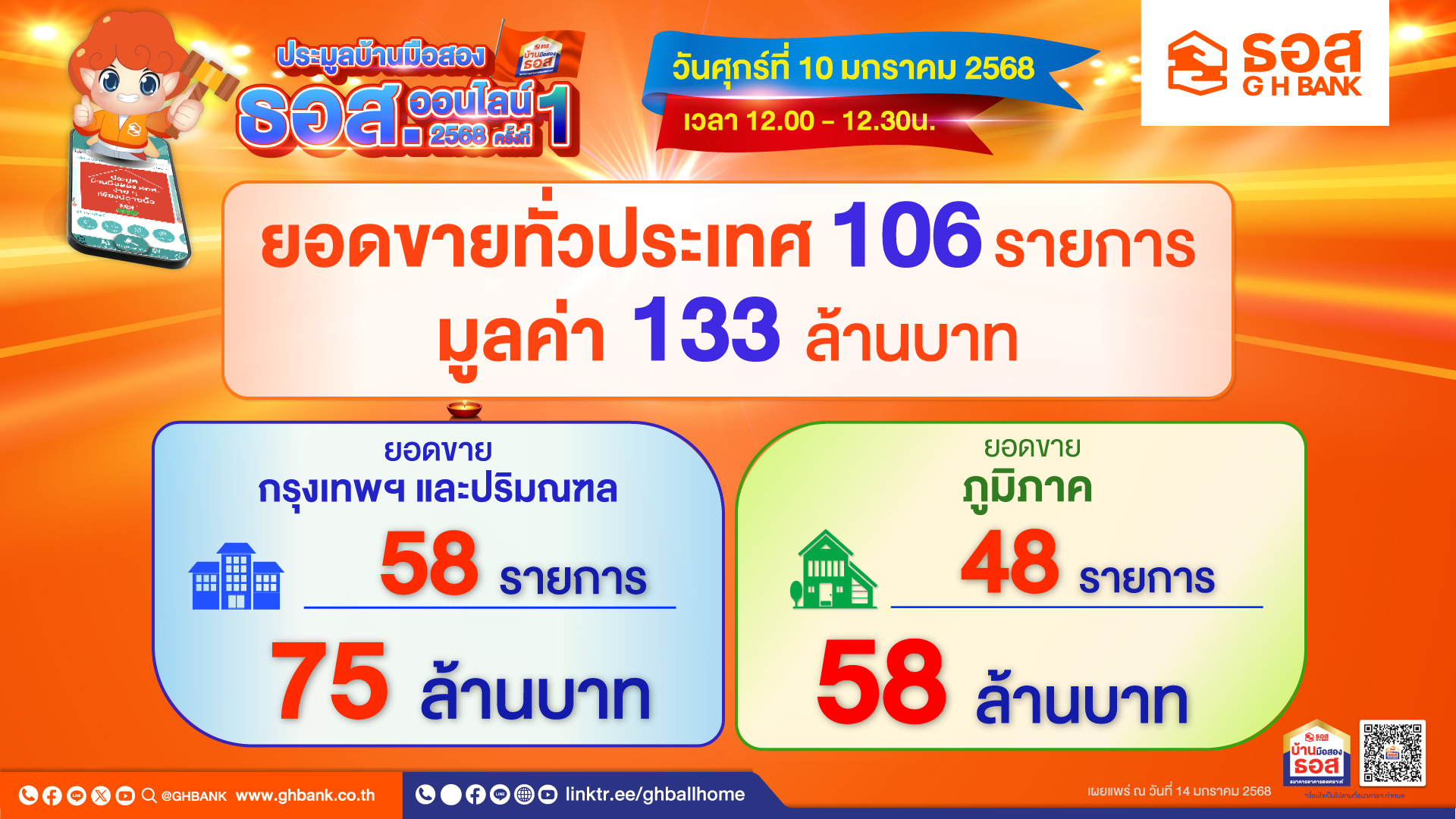 ธนาคารอาคารสงเคราะห์ (ธอส.) จัด “งานประมูลบ้านมือสองออนไลน์ : GHB’S NPA Online Auction 2025” ประจำเดือนมกราคม 2568 เมื่อวันศุกร์ที่ 10 มกราคม 2568 ระหว่างเวลา 12.00 – 12.30 น. พร้อมกันทั่วประเทศ ผ่าน Application : GHB ALL HOME โดยสามารถจำหน่ายบ้านมือสองได้จำนวน 106 รายการ เป็นมูลค่ารวม 133 ล้านบาท แบ่งเป็น ทรัพย์ที่ตั้งอยู่ในพื้นที่กรุงเทพฯ และปริมณฑล จำนวน 58 รายการ รวมมูลค่า 75 ล้านบาท และในส่วนภูมิภาค จำนวน 48 รายการ รวมมูลค่า 58 ล้านบาท โดยรายการทรัพย์ที่ประมูลได้ในราคาต่ำที่สุดเพียง 90,000 บาท เป็นทรัพย์ประเภทที่ดินเปล่า ขนาดเนื้อที่ 82 ตารางวา ในอำเภอเมืองขอนแก่น จังหวัดขอนแก่น และทรัพย์ที่ประมูลในราคาสูงสุด เป็นทรัพย์ประเภทบ้านแฝด ขนาดเนื้อที่ 41.1 ตารางวา ในอำเภอเมืองนนทบุรี จังหวัดนนทบุรี โดยประมูลขายได้ในราคา 4.2 ล้านบาท พิเศษ! ผู้ชนะการประมูลสามารถใช้ “ผลิตภัณฑ์สินเชื่อสำหรับซื้อทรัพย์ NPA พร้อมขายของธนาคาร” โดยได้รับอัตราดอกเบี้ยต่ำสุด นานสูงสุด 24 เดือน (เงื่อนไขเป็นไปตามหลักเกณฑ์ที่ธนาคารกำหนด) และหากทำนิติกรรมและโอนกรรมสิทธิ์ ภายในวันที่ 11 มีนาคม 2568 จะได้รับส่วนลด On top 15% อีกด้วย โดยสอบถามข้อมูลเพิ่มเติมได้ที่ G H Bank Call Center โทร.0-2645-9000 กด 5 หรือ Facebook Fanpage ธนาคารอาคารสงเคราะห์ หรือ ดูข้อมูลบ้านมือสอง ธอส. ได้ที่ www.ghbhomecenter.com และ Application : GHB ALL HOME