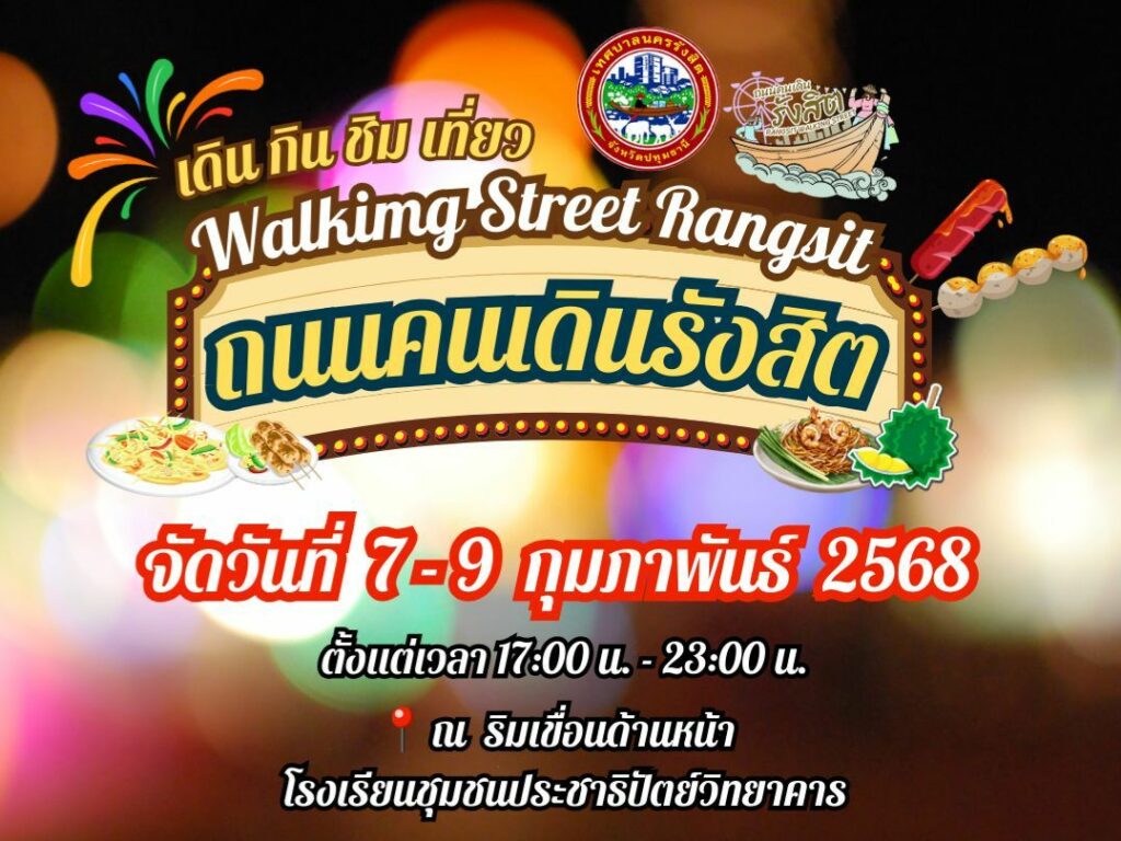 เทศบาลนครรังสิต ขอเชิญร่วมงาน ” เดิน กิน ชิม เที่ยว ” ถนนคนเดินรังสิต วันที่ 7 – 9 กุมภาพันธ์ 2568