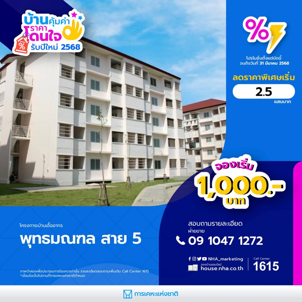 การเคหะแห่งชาติ เปิดจองโครงการบ้านเอื้ออาทรพุทธมณฑล สาย 5 อาคารชุด 5 ชั้น 1 ห้องนอน 1 ห้องน้ำ ลดราคาพิเศษ เริ่ม 2.5 แสนบาท* เริ่มตั้งแต่บัดนี้ – 31 มีนาคม 2568