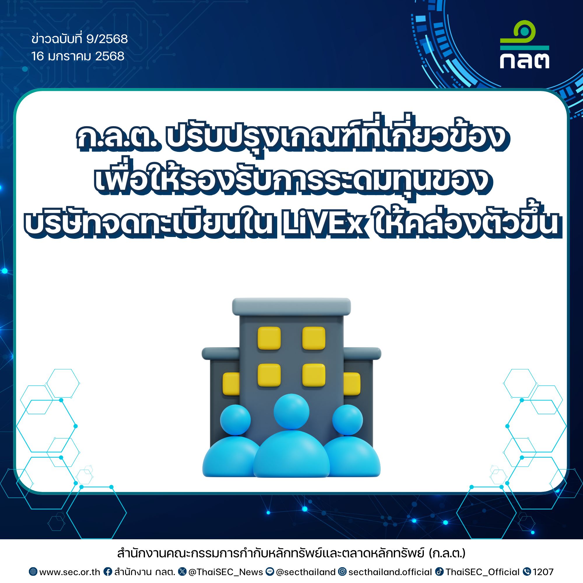 ก.ล.ต. ปรับปรุงเกณฑ์ที่เกี่ยวข้องเพื่อให้รองรับการระดมทุนของบริษัทจดทะเบียนใน LiVEx ให้คล่องตัวขึ้น