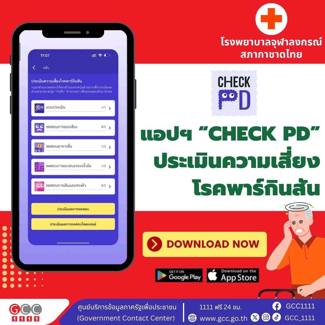 โรงพยาบาลจุฬาลงกรณ์ ร่วมกับ สภากาชาดไทย พัฒนาแอปพลิเคชั่น Check PD ตรวจหาความเสี่ยงโรคพาร์กินสันด้วยตนเอง ใช้เวลาประมาณ 25 นาทีในการทำแบบประเมินความเสี่ยง 20 ข้อ เหมาะสำหรับผู้ที่มีอายุ 40 ปีขึ้นไป ซึ่งแอปฯ จะประเมินความเสี่ยงด้วยการเช็กการตอบคำถาม การทดสอบขยับนิ้ว การทดสอบอาการสั่น การทดสอบการทรงตัว การทดสอบการออกเสียง หลังจบทุกขั้นตอนการแล้ว สามารถกดรับผลในแอปฯ ได้ทันที ผลที่ได้ให้ความแม่นยำสูงถึง 90%