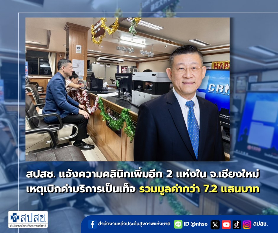 สปสช. แจ้งความคลินิกเพิ่มอีก 2 แห่งในจังหวัดเชียงใหม่ เหตุเบิกค่าบริการเป็นเท็จ รวมมูลค่ากว่า 7.2 แสนบาท