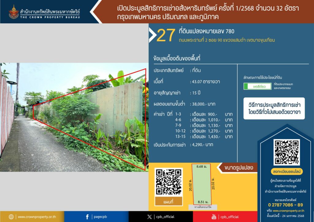 - สำนักงานทรัพย์สินพระมหากษัตริย์ เปิดประมูลสิทธิการเช่า 15 ปี ที่ดินแปลงหมายเลข 780