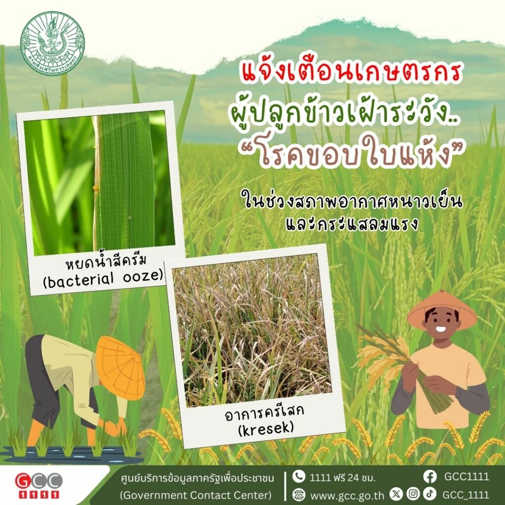 กรมส่งเสริมการเกษตร แจ้งเตือนเกษตรกรผู้ปลูกข้าวเฝ้าระวัง “โรคขอบใบแห้ง” ในช่วงสภาพอากาศหนาวเย็นและกระแสลมแรง ซึ่งสามารถแพร่ระบาดไปกับกระแสลมได้ โดยเฉพาะในสภาพแวดล้อมที่มีความชื้นสัมพัทธ์สูงหรือมีหมอกหนา ในช่วงเดือนมกราคมถึงมีนาคม อาการของโรคเริ่มจากขอบใบข้าวเป็นสีเหลืองและขยายเป็นทางยาวตามใบ ขอบใบจะมีหยดน้ำสีครีมคล้ายยางสน และใบจะแห้งเร็ว หากโรคระบาดรุนแรง ต้นข้าวอาจแห้งตายทั้งต้น การป้องกันโรคสามารถทำได้โดยการเลือกใช้พันธุ์ข้าวที่ต้านทานโรค เช่น สุพรรณบุรี 1, สุพรรณบุรี 60, สุพรรณบุรี 90, กข 7 และควรหลีกเลี่ยงการใส่ปุ๋ยไนโตรเจนในปริมาณมาก นอกจากนี้ ควรเฝ้าระวังและพ่นสารป้องกันโรคพืชเมื่อพบอาการ เช่น ซิงค์ไทอะโซล หรือ คอปเปอร์ไฮดรอกไซด์