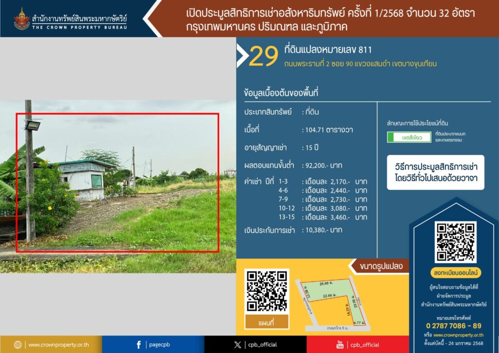 สำนักงานทรัพย์สินพระมหากษัตริย์ เปิดประมูลสิทธิการเช่า 15 ปี ที่ดินแปลงหมายเลข 811 ตั้งแต่บัดนี้ – 24 มกราคม 2568 ค่าเช่าเริ่มต้นที่ 2,170.- บาท/เดือน