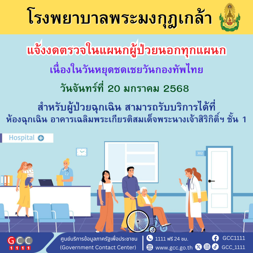 โรงพยาบาลพระมงกุฎเกล้า แจ้งงดทำการตรวจในแผนกผู้ป่วยนอกทุกแผนก เนื่องในวันหยุดชดเชยวันกองทัพไทย วันจันทร์ที่ 20 มกราคม 2568 สำหรับผู้ป่วยฉุกเฉิน สามารถรับบริการได้ที่ห้องฉุกเฉิน อาคารเฉลิมพระเกียรติสมเด็จพระนางเจ้าสิริกิติ์ฯ ชั้น 1