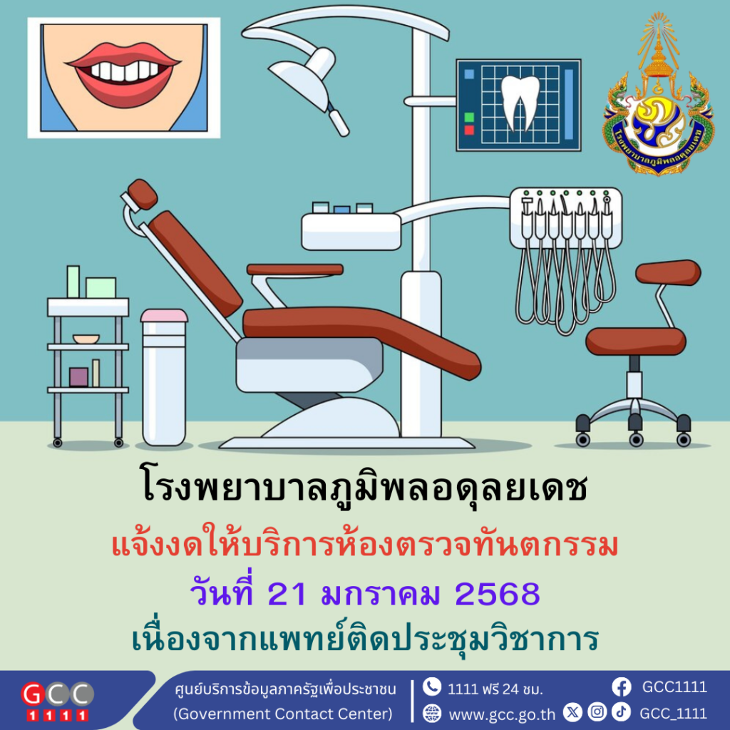 โรงพยาบาลภูมิพลอดุลยเดช แจ้งงดให้บริการห้องตรวจทันตกรรม วันที่ 21 มกราคมา 2568