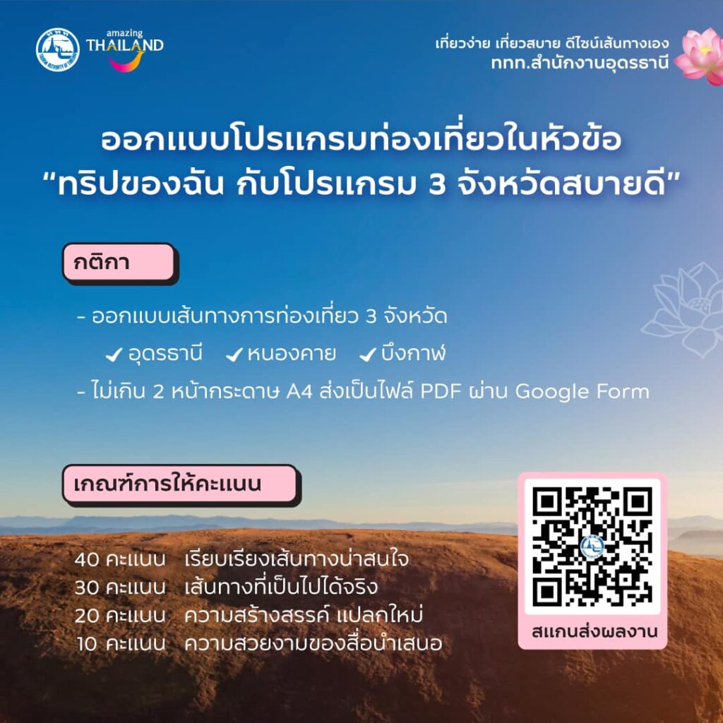 การท่องเที่ยวแห่งประเทศไทย สำนักงานอุดรธานี เชิญชวนออกแบบโปรแกรมท่องเที่ยว 3 จังหวัด อุดรธานี, หนองคาย และบึงกาฬ เพื่อชิงเงินรางวัลและของสมนาคุณมากกว่า 10,000 บาทเริ่มส่งผลงานได้ตั้งแต่บัดนี้ – 16 กุมภาพันธ์ 2568 ประกาศผลรางวัล 19 กุมภาพันธ์ 2568