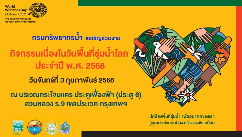 - กรมทรัพยากรน้ำ ขอเชิญร่วมงาน “การจัดกิจกรรมเนื่องในวันพื้นที่ชุ่มน้ำโลก ประจำปี พ.ศ.2568”