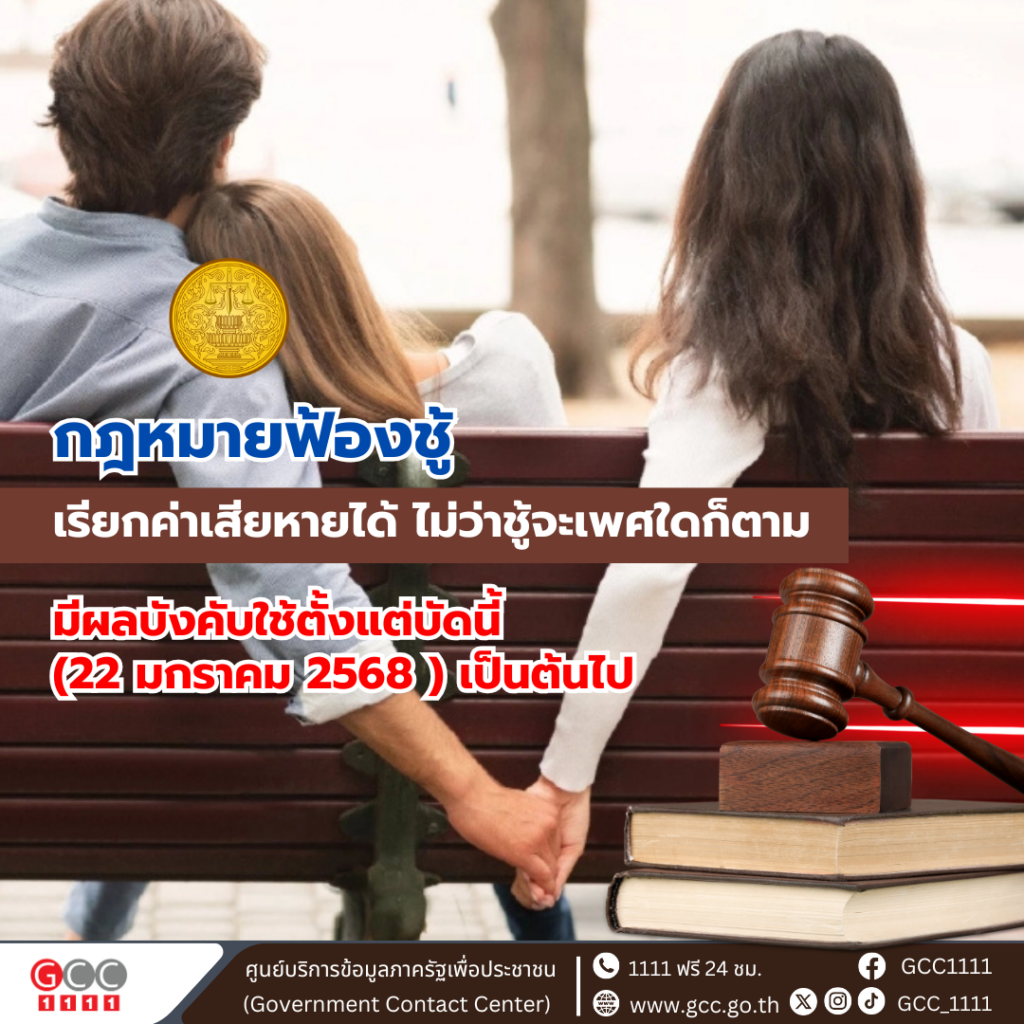 กฎหมายฟ้องชู้ เรียกค่าเสียหายได้ ไม่ว่าชู้จะเพศใดก็ตาม มีผลบังคับใช้ตั้งแต่บัดนี้ (22 มกราคม 2568 ) เป็นต้นไป