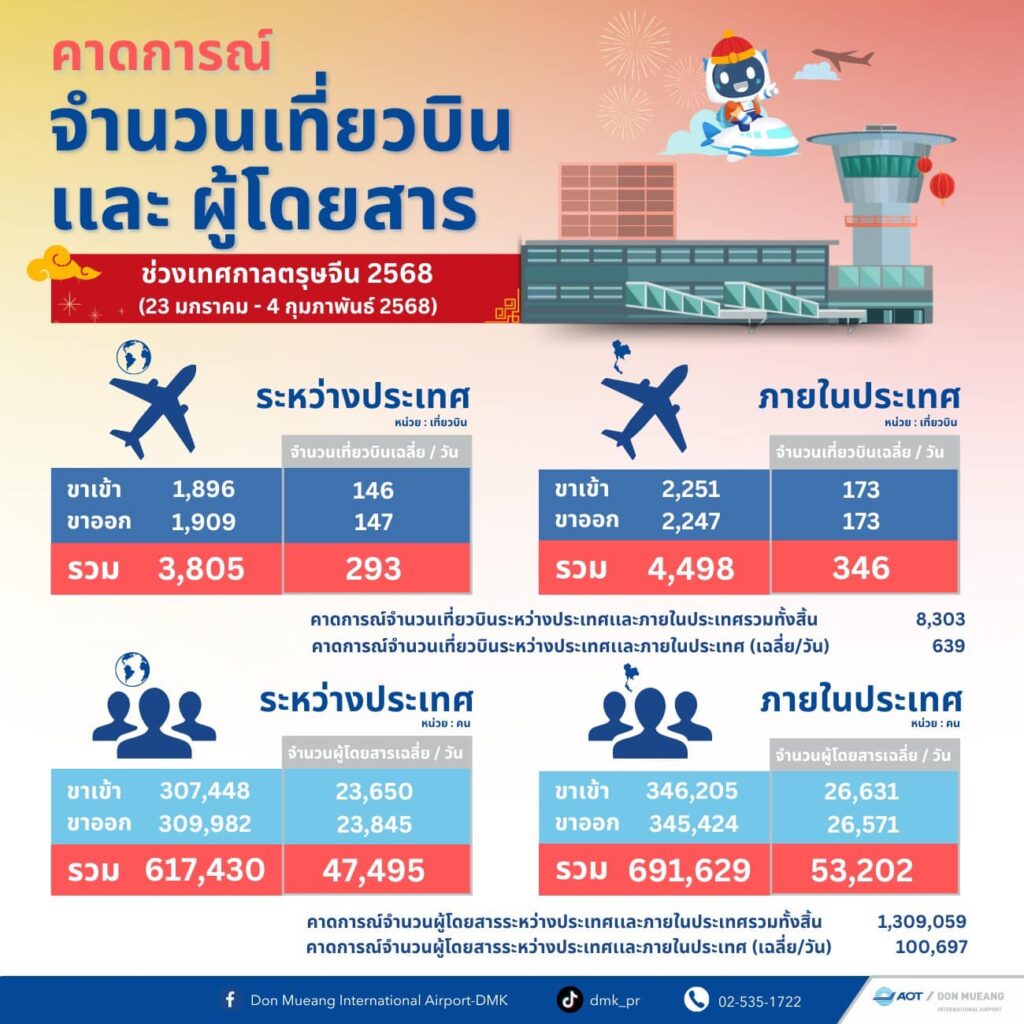 ท่าอากาศยานดอนเมือง คาดการณ์จำนวนเที่ยวบินและจำนวนผู้โดยสารที่เดินทางท่องเที่ยว ณ ท่าอากาศยานดอนเมือง ในช่วงเทศกาลตรุษจีน 2568 ระหว่างวันที่ 23 มกราคม – 4 กุมภาพันธ์ 2568 (รวม 13 วัน)