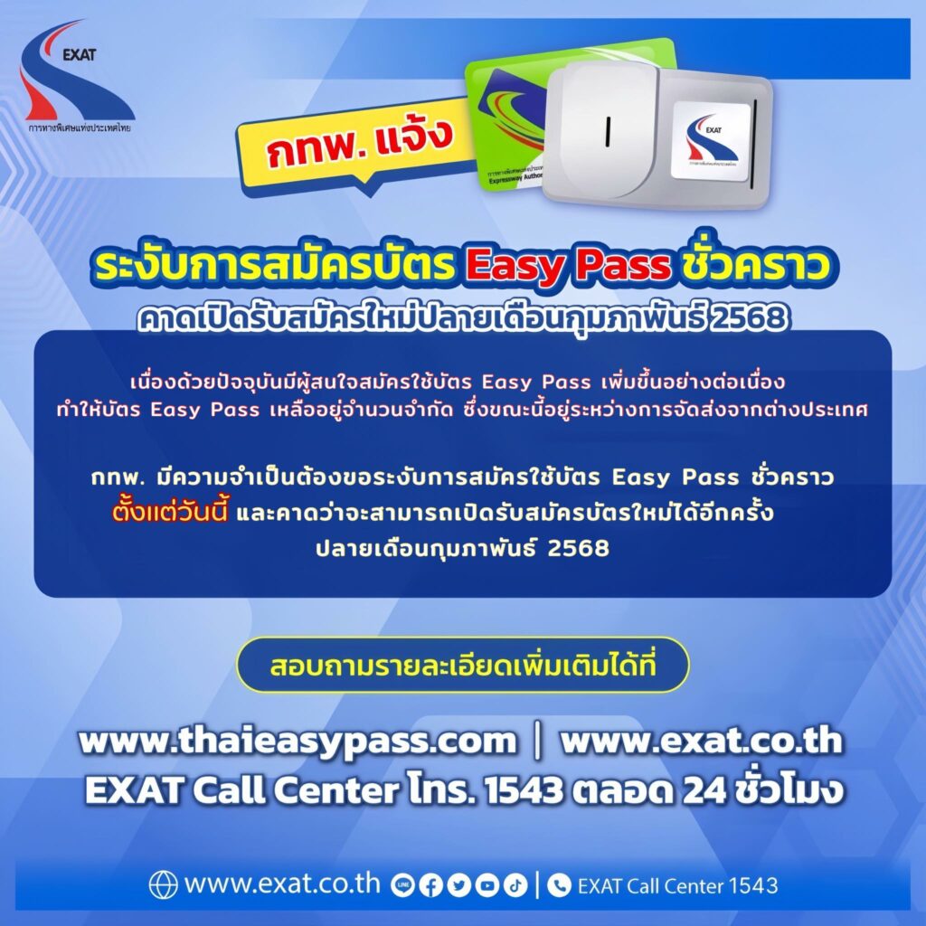การทางพิเศษแห่งประเทศไทย แจ้งระงับการสมัครบัตร Easy Pass ชั่วคราว คาดว่าเปิดรับสมัครใหม่ปลายเดือนกุมภาพันธ์ 2568 เนื่องด้วยในปัจจุบันมีผู้สนใจสมัครบัตร Easy Pass เพิ่มขึ้นอย่างต่อเนื่อง ทำให้บัตร Easy Pass เหลืออยู่จำนวนจำกัด ซึ่งขณะนี้อยู่ระหว่างการจัดส่งบัตร Easy Pass จากต่างประเทศ จึงมีความจำเป็นต้องระงับการสมัครบัตร Easy Pass ชั่วคราวตั้งแต่บัดนี้ และคาดว่าจะสามารถเปิดรับสมัครบัตรใหม่ได้อีกครั้งในช่วงปลายเดือนกุมภาพันธ์ 2568 สอบถามรายละเอียดเพิ่มเติมได้ที่ www.thaieasypass.com www.exat.co.th หรือ EXAT Call Center โทร 1543 ตลอด 24 ชั่วโมง