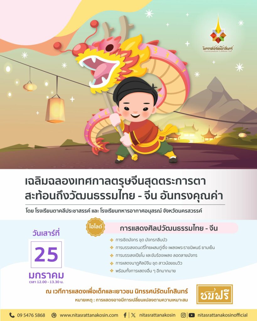 นิทรรศน์รัตนโกสินทร์ จัดเวทีการแสดงเพื่อเด็กและเยาวชน วันเสาร์ที่ 25 มกราคม 2568 ร่วมเฉลิมฉลองเทศกาลตรุษจีนสุดตระการตา กับการแสดงที่สะท้อนถึงวัฒนธรรมไทย – จีน อันทรงคุณค่า โดย โรงเรียนตาคลีประชาสรรค์ และ โรงเรียนทหารอากาศอนุสรณ์ จังหวัดนครสวรรค์