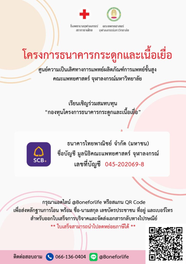 ขอเชิญร่วมสมทบทุน “กองทุนโครงการธนาคารกระดูกและเนื้อเยื่อ” ธนาคารไทยพาณิชย์ ชื่อบัญชี มูลนิธิคณะแพทยศาสตร์ จุฬาลงกรณ์ เลขที่ 045-202069-8 ใบเสร็จสามารถนำไปลดหย่อนภาษีได้