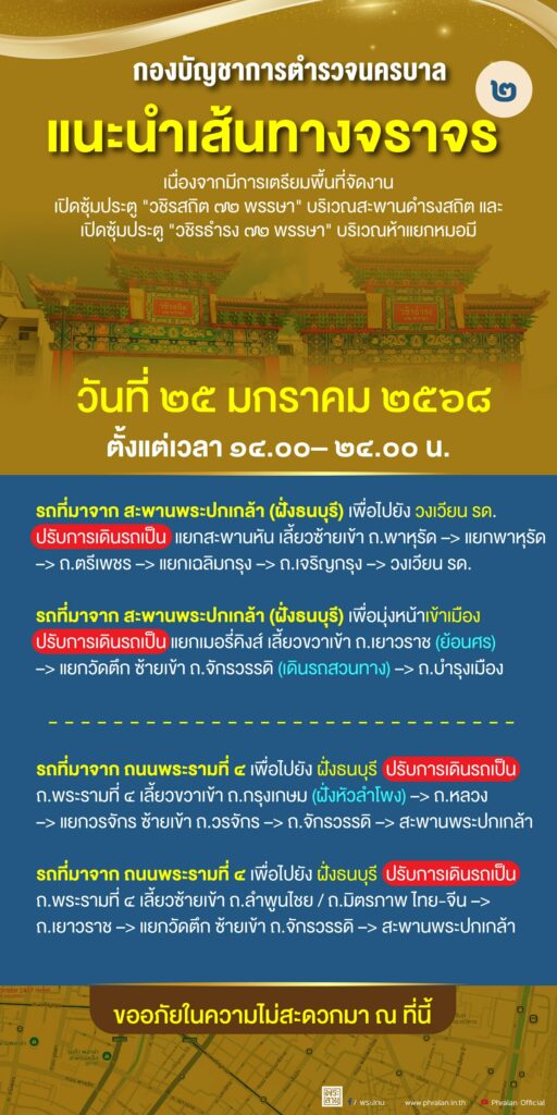 กองบัญชาการตำรวจนครบาล แนะนำเส้นทางจราจร วันที่ 24 – 25 มกราคม 2568
