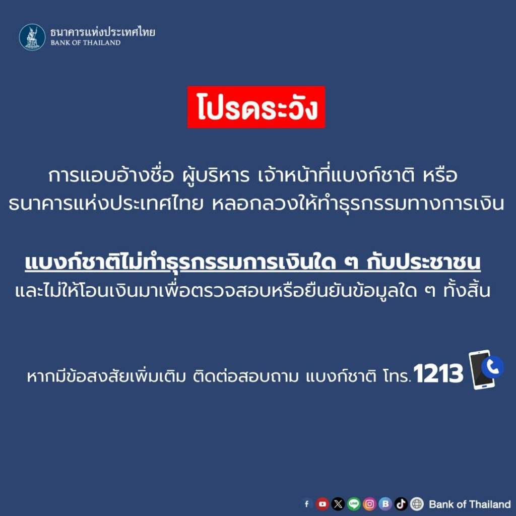ธนาคารแห่งประเทศไทย เตือนโปรดระวัง การแอบอ้างชื่อผู้บริหาร หรือเจ้าหน้าที่แบงก์ชาติ หลอกลวงให้ทำธุรกรรมทางการเงิน ธนาคารแห่งประเทศไทย ไม่ทำธุรกรรมการเงินใด ๆ กับประชาชน หากมีข้อสงสัย ติดต่อสอบถามได้เลยที่ 1213