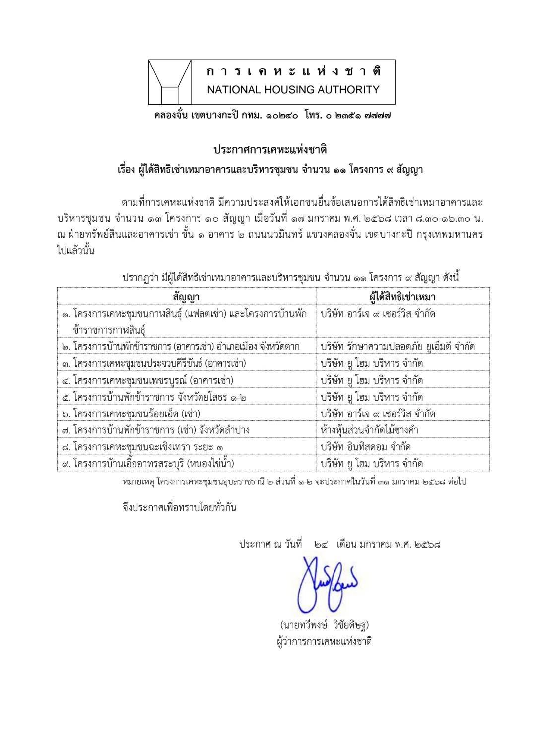 การเคหะแห่งชาติ ประกาศผู้ได้สิทธิเช่าเหมาอาคารและบริหารชุมชน จำนวน 11 โครงการ 9 สัญญา