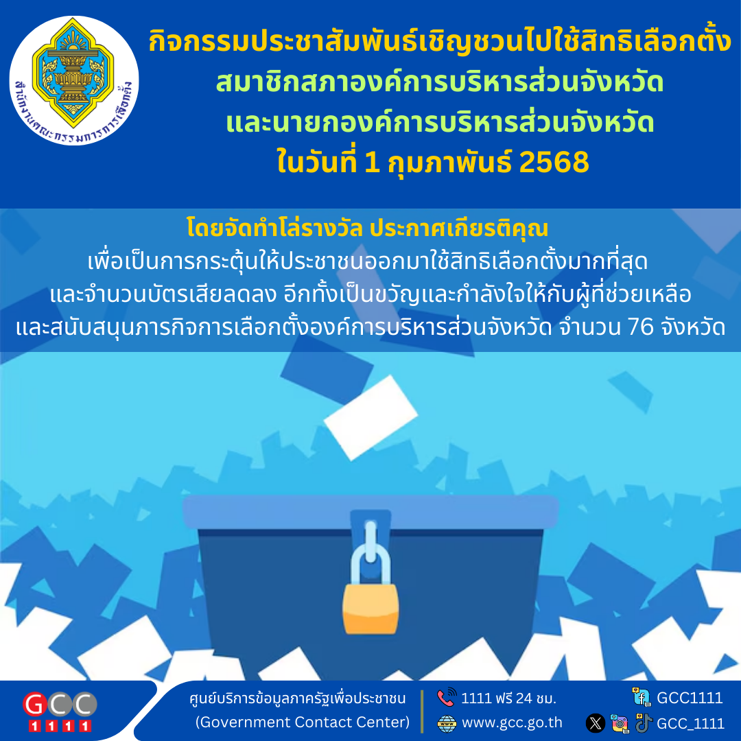 ทั้งนี้ สามารถติดตามข้อมูลข่าวสารเกี่ยวกับการเลือกตั้งสมาชิกสภาองค์การบริหารส่วนจังหวัด และนายกองค์การบริหารส่วนจังหวัด ได้ที่เว็บไซต์สํานักงานคณะกรรมการการเลือกตั้ง www.ect.go.th หรือ Application Smart Vote หรือสํานักงานคณะกรรมการการเลือกตั้งประจําจังหวัด หรือสอบถาม รายละเอียดเพิ่มเติมได้ที่บริการสายด่วน 1444