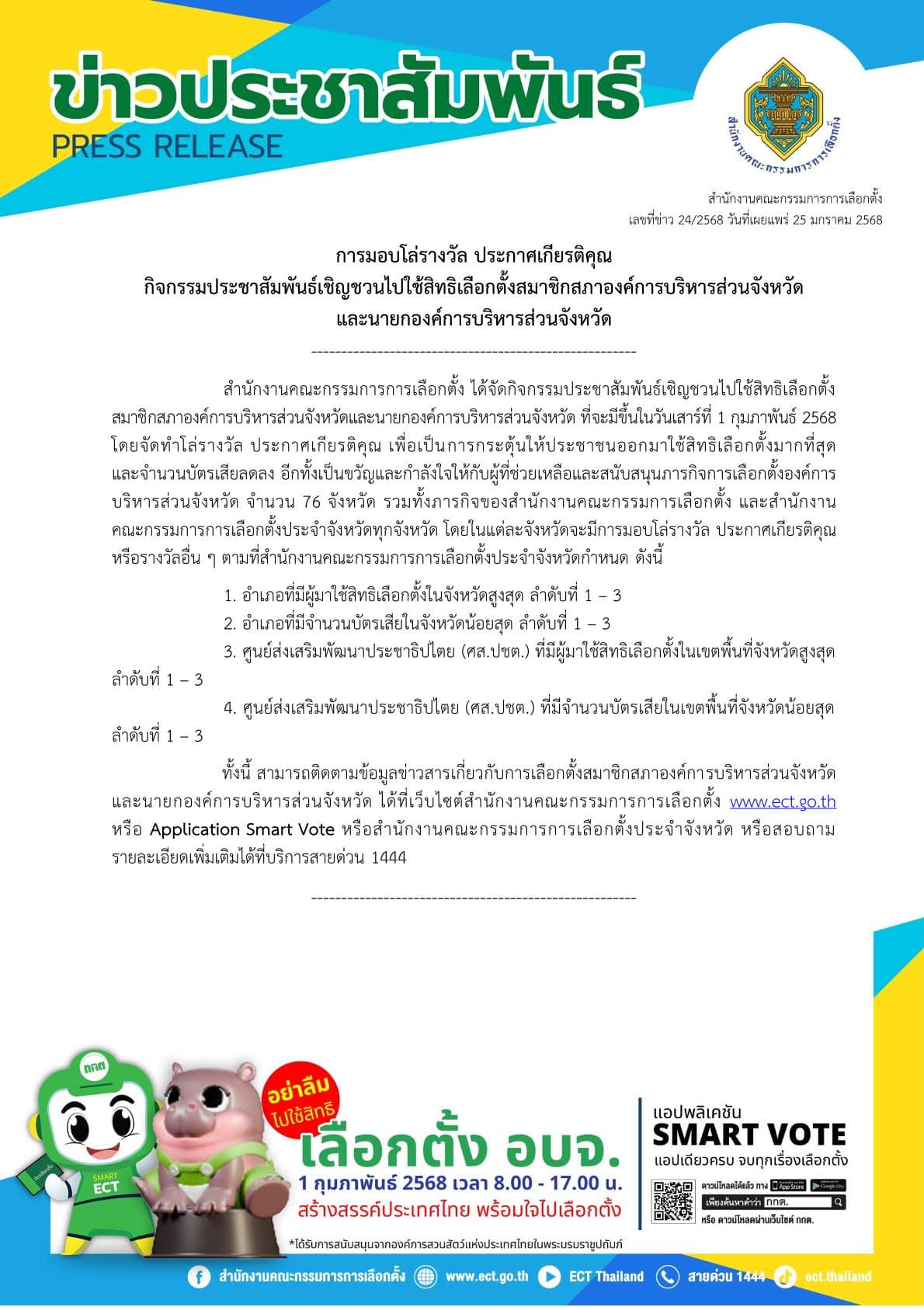 สํานักงานคณะกรรมการการเลือกตั้ง ได้จัดกิจกรรมประชาสัมพันธ์เชิญชวนไปใช้สิทธิเลือกตั้ง สมาชิกสภาองค์การบริหารส่วนจังหวัดและนายกองค์การบริหารส่วนจังหวัด ที่จะมีขึ้นในวันเสาร์ที่ 1 กุมภาพันธ์ 2568 โดยจัดทําโล่รางวัล ประกาศเกียรติคุณ เพื่อเป็นการกระตุ้นให้ประชาชนออกมาใช้สิทธิเลือกตั้งมากที่สุด และจํานวนบัตรเสียลดลง อีกทั้งเป็นขวัญและกําลังใจให้กับผู้ที่ช่วยเหลือและสนับสนุนภารกิจการเลือกตั้งองค์การ บริหารส่วนจังหวัด จํานวน 76 จังหวัด รวมทั้งภารกิจของสํานักงานคณะกรรมการเลือกตั้ง และสํานักงาน คณะกรรมการการเลือกตั้งประจําจังหวัดทุกจังหวัด โดยในแต่ละจังหวัดจะมีการมอบโล่รางวัล ประกาศเกียรติคุณ หรือรางวัลอื่น ๆ ตามที่สํานักงานคณะกรรมการการเลือกตั้งประจําจังหวัดกําหนด ดังนี้