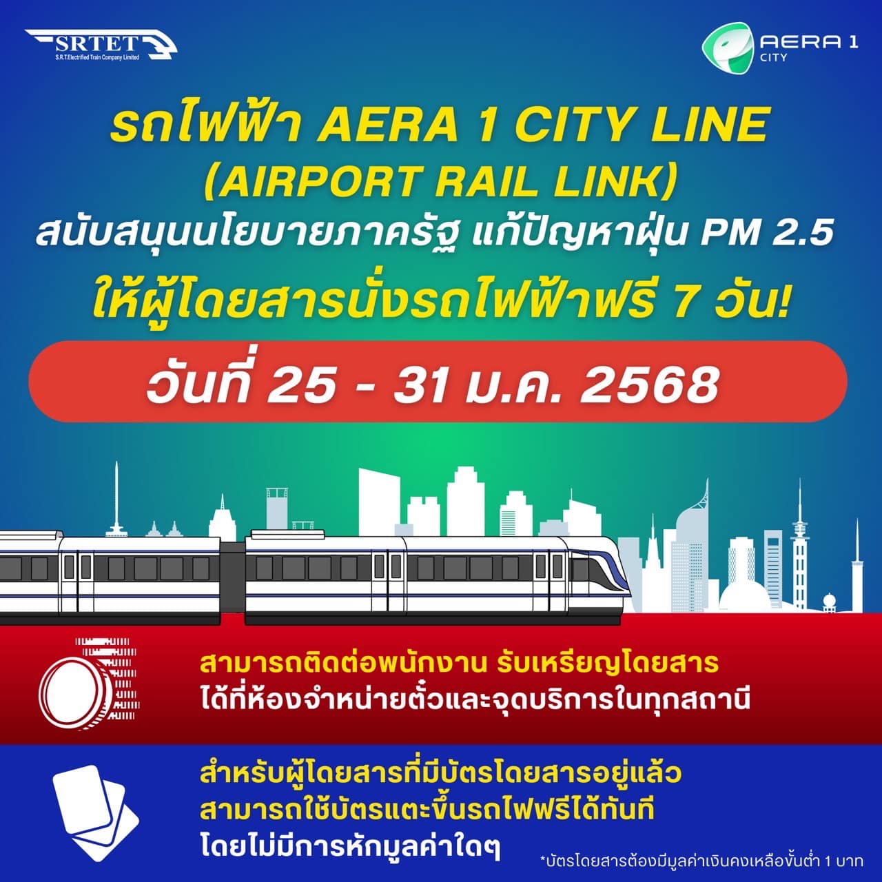 รถไฟฟ้า AERA 1 CITY LINE (Airport Rail Link) สนับสนุนนโยบายภาครัฐ ในการแก้ปัญหาฝุ่น PM 2.5 ที่เกิดขึ้นอยู่ในตอนนี้ เปิดให้ผู้โดยสารนั่งรถไฟฟ้าฟรี เป็นเวลา 7 วัน ตั้งแต่วันที่ 25 – 31 มกราคม 2568