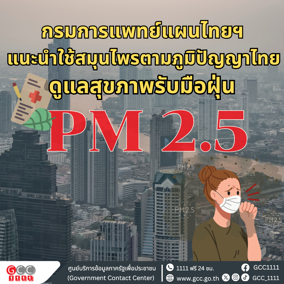 ทางกรมการแพทย์แผนไทยและการแพทย์ทางเลือก จึงสนับสนุนการใช้สมุนไพรตามภูมิปัญญาไทยในการดูแลตัวเองในสถานการณ์ฝุ่น PM 2.5 โดยเฉพาะผู้ป่วยโรคประจำตัว เช่น โรคระบบทางเดินหายใจ โรคปอด โรคหัวใจ โรคความดันโลหิตสูง และโรคผิวหนัง ที่ต้องระวังเป็นพิเศษ เนื่องจากฝุ่น PM 2.5 มีอนุภาคขนาดเล็กมาก สามารถหลุดผ่านขนจมูกเข้าสู่ร่างกาย ก่อให้เกิดการระคายเคืองในระบบทางเดินหายใจ การอักเสบในอวัยวะต่างๆ รวมถึงเพิ่มความเสี่ยงต่อการกำเริบของโรคเรื้อรังดังกล่าวได้ ดังนั้น การนำสมุนไพร เช่น มะขามป้อม บรรเทาอาการไอ บรรเทาอาการระคายคอ ขมิ้นชัน และชาชงรางจืด ต้านการอักเสบของร่างกาย สำหรับปัญหาผิวหนังที่เกิดจากฝุ่น PM 2.5 เช่น ผด ผื่น และอาการคัน ควรใช้ผลิตภัณฑ์สมุนไพรที่ช่วยเพิ่มความชุ่มชื้นและลดการอักเสบ เช่น ว่านหางจระเข้ บัวบก โลชั่นพญายอ ส่วนอาการผิวหนังอักเสบหรือผื่นลมพิษควรใช้ผลิตภัณฑ์ที่มีส่วนผสมของพลู หรือ ขี้ผึ้งพญายอ ใช้ทาบรรเทาอาการ ผื่น แพ้ คัน และการอักเสบของผิวหนัง ผลิตภัณฑ์เหล่านี้มีจำหน่ายทั่วไปตามร้านขายยา หรือ ร้านค้าสะดวกซื้อทั่วไป