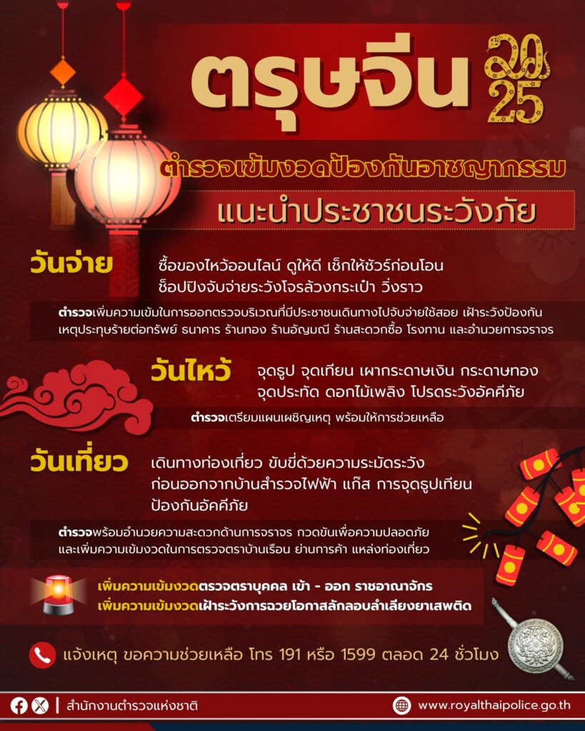 สำนักงานตำรวจแห่งชาติ เพิ่มมาตรการดูแลความปลอดภัย ช่วงเทศกาลตรุษจีน วันที่ 27 – 29 มกราคม 2568 ทั้งในด้านชีวิตและทรัพย์สินของประชาชน