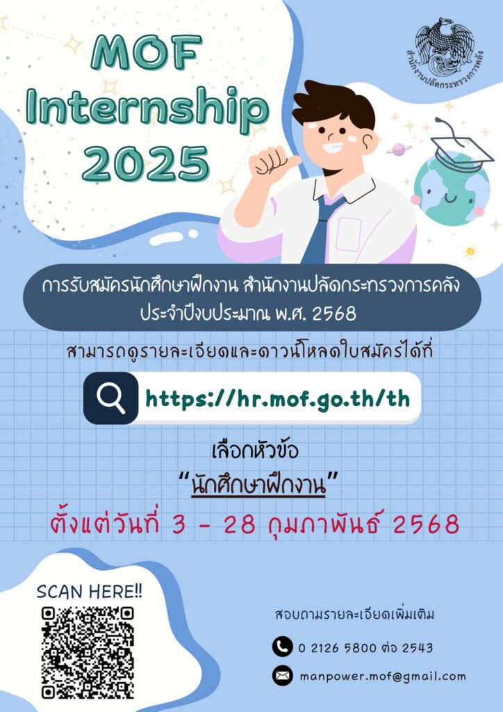 - รายละเอียดเพิ่มเติมและดาวน์โหลดใบสมัครได้ที่ QR Code หรือ https://hr.mof.go.th/th หัวข้อ “นักศึกษาฝึกงาน”