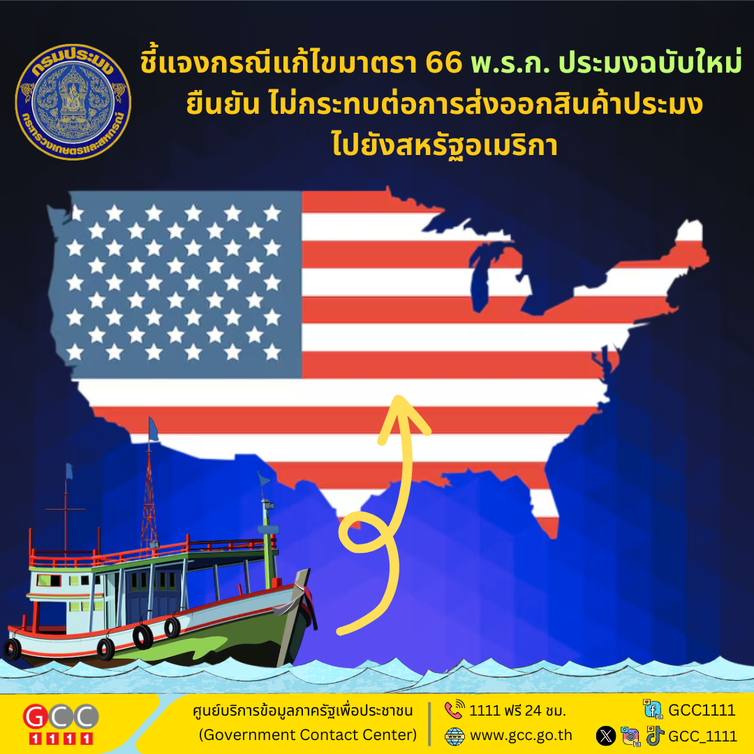 กรมประมง ชี้แจงกรณีแก้ไขมาตรา 66 พ.ร.ก. ประมงฉบับใหม่ ยืนยัน ไม่กระทบต่อการส่งออกสินค้าประมงไปยังสหรัฐอเมริกา