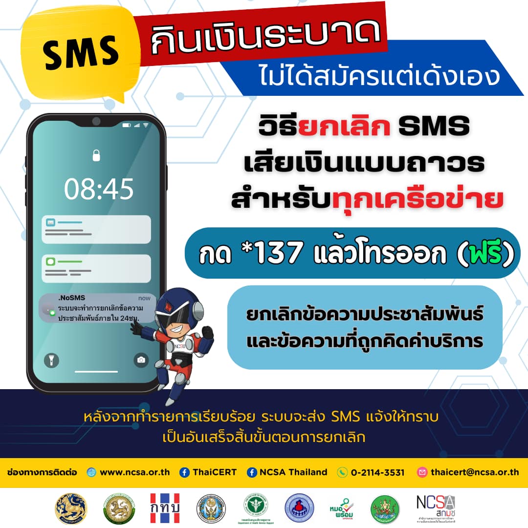 สำนักงานคณะกรรมการการรักษาความมั่นคงปลอดภัยไซเบอร์แห่งชาติ แจ้งเตือน SMS กินเงินระบาด ไม่ได้สมัครแต่เด้งเอง