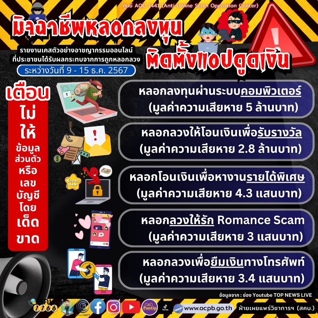 สำนักงานปลัดสำนักนายกรัฐมนตรี แจ้งเตือนมิจฉาชีพหลอกลงทุน ติดตั้งแอปดูดเงิน โดยรายงานเคสตัวอย่างอาชญากรรมออนไลน์ ที่ประชาชนได้รับผลกระทบจากการถูกหลอกลวง ระหว่างวันที่ 9 – 15 ธันวาคม 2567 ดังนี้