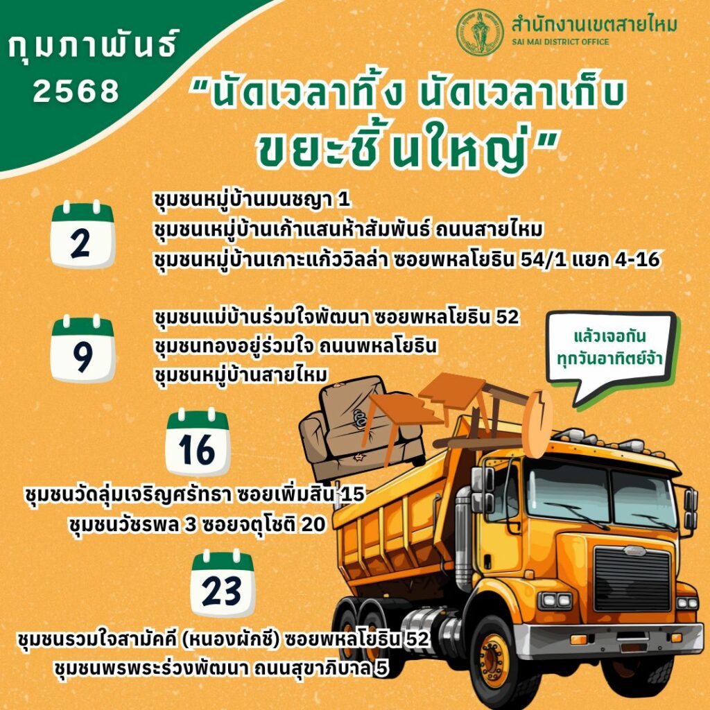 สำนักงานเขตสายไหม นัดเวลาทิ้ง นัดเวลาเก็บ ขยะชิ้นใหญ่ ประจำเดือน กุมภาพันธ์ 2568