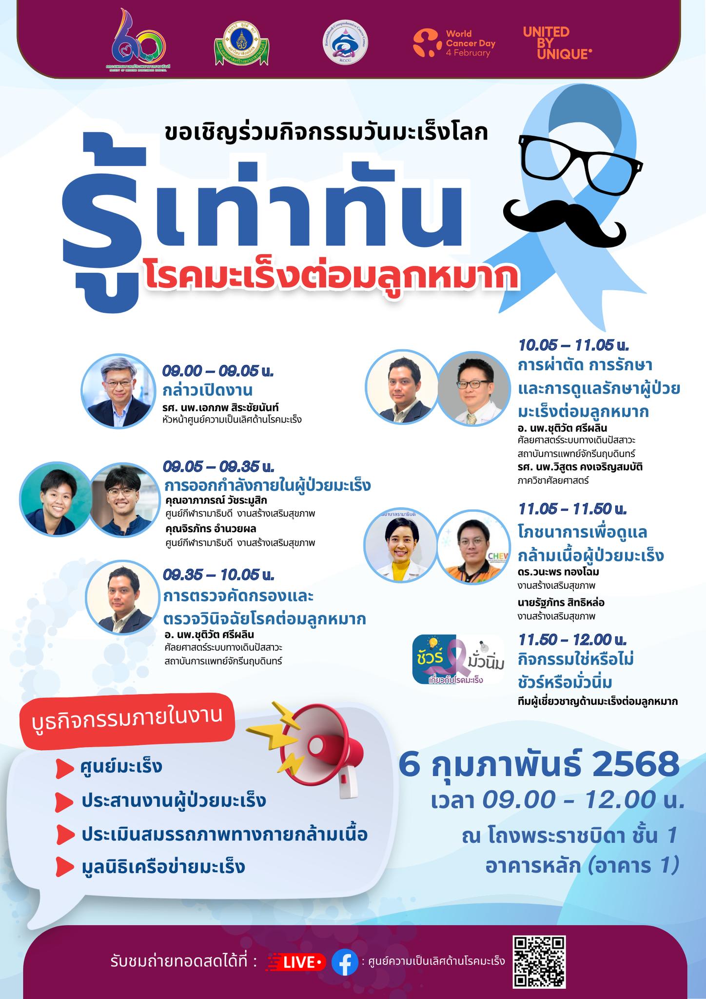คณะแพทยศาสตร์โรงพยาบาลรามาธิบดี จัดกิจกรรม วันมะเร็งโลก World Cancer Day ” United by Unique ” ให้ความรู้ประชาชน ในหัวข้อ รู้เท่าทัน”มะเร็งต่อมลูกหมาก” วันพุธที่ 6 กุมภาพันธ์ 2568 เวลา 09.00 – 12.00 น. ณ โถงพระบิดา ชั้น 1 อาคาร 1 (อาคารหลัก) หรือรับชมการถ่ายทอดสดได้ที่ Facebook: ศูนย์ความเป็นเลิศด้านโรคมะเร็ง