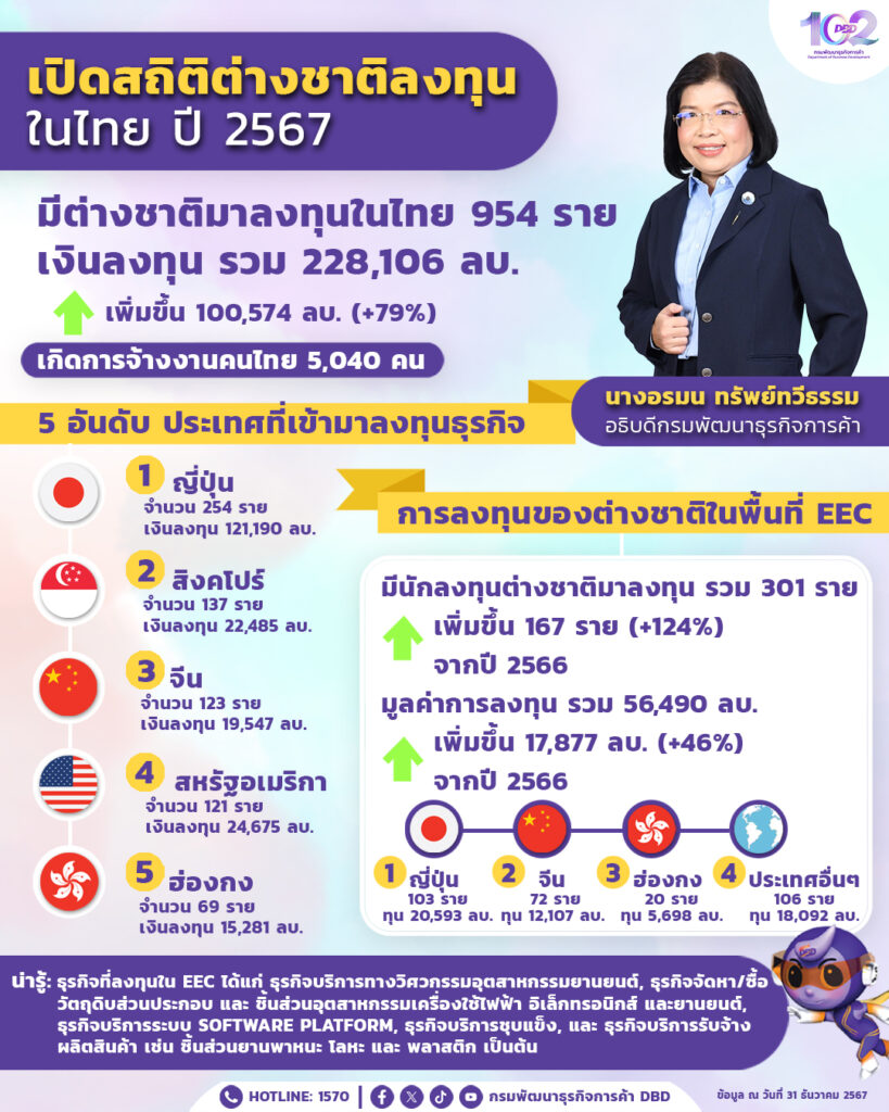 นางอรมน ทรัพย์ทวีธรรม อธิบดีกรมพัฒนาธุรกิจการค้า กระทรวงพาณิชย์ ในฐานะเลขานุการคณะกรรมการการประกอบธุรกิจของคนต่างด้าว พ.ศ.2542 เปิดเผยว่า ปี 2567 มีการอนุญาตให้คนต่างชาติเข้ามาลงทุนประกอบธุรกิจในประเทศไทย ภายใต้พระราชบัญญัติการประกอบธุรกิจของคนต่างด้าว พ.ศ. 2542 จำนวน 954 ราย โดยเป็นการลงทุนผ่านช่องทางการขอรับใบอนุญาตประกอบธุรกิจของคนต่างด้าว 227 ราย และการขอหนังสือรับรองการประกอบธุรกิจของคนต่างด้าว (ผ่านช่องทางการลงทุนตามกฎหมายว่าด้วยการส่งเสริมการลงทุน หรือได้รับอนุญาตตามกฎหมายว่าด้วยการนิคมอุตสาหกรรมแห่งประเทศไทย และการใช้สิทธิตามสนธิสัญญาหรือความตกลงระหว่างประเทศ) 727 ราย เงินลงทุนรวมทั้งสิ้น 228,106 ล้านบาท