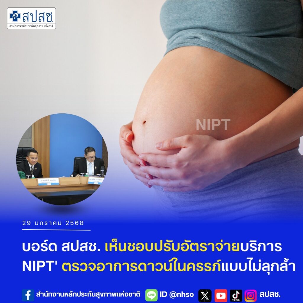 สำนักงานหลักประกันสุขภาพแห่งชาติ เห็นชอบปรับอัตราการจ่ายค่าบริการตรวจคัดกรองดาวน์ในหญิงตั้งครรภ์ด้วยวิธีไม่ลุกล้ำ หรือ NIPT จำนวน 2,700 บาทต่อครั้ง หนุนหน่วยบริการที่มีศักยภาพ ดูแลหญิงไทยตั้งครรภ์ เข้าถึงการตรวจที่แม่นยำอย่างครอบคลุมมากขึ้น