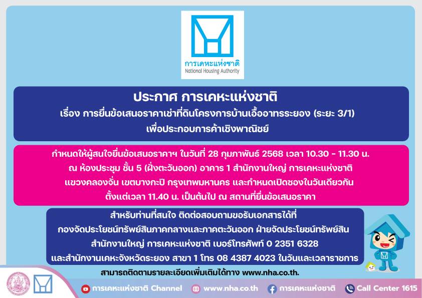 สอบถามรายละเอียดเพิ่มเติมและขอรับเอกสารการยื่นข้อเสนอราคาได้ที่กองจัดประโยชน์ทรัพย์สินภาคกลางและภาคตะวันออก ฝ่ายจัดประโยชน์ทรัพย์สิน ชั้น 5 อาคาร 1 สำนักงานใหญ่ การเคหะแห่งชาติ 905 ถนนนวมินทร์ แขวงคลองจั่น เขตบางกะปิ กรุงเทพมหานคร โทร 0 2351 6328 และสำนักงานเคหะจังหวัดระยองสาขา 1 เลขที่ 126 หมู่ 2 ตำบลทับมา อำเภอเมืองระยอง จังหวัดระยอง โทร 08 4387 4023 ในวันและเวลาทำการหรือดูรายละเอียดเพิ่มเติมได้ที่ www.nha.co.th