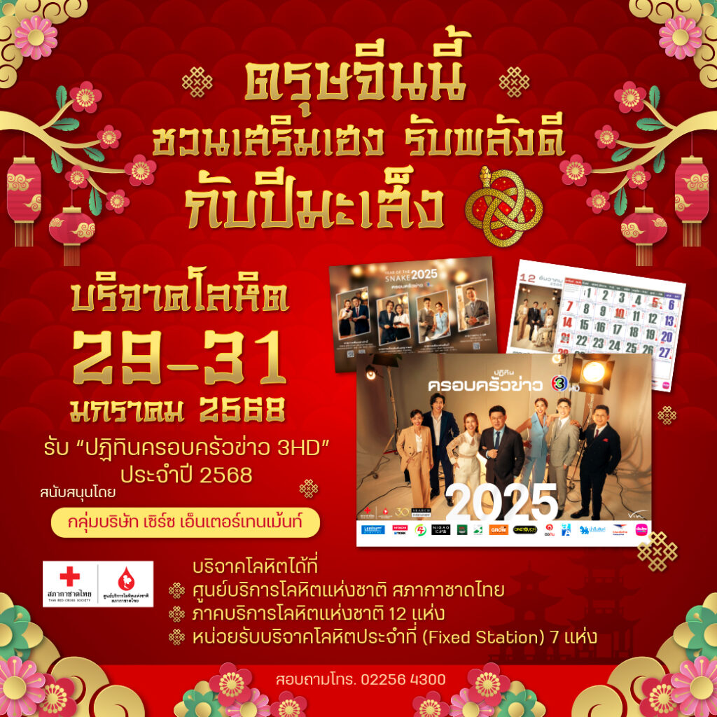 ศูนย์บริการโลหิตแห่งชาติ สภากาชาดไทย เชิญชวนเสริมเฮงตรุษจีน รับพลังดี กับปีมะเส็ง ร่วมบริการโลหิต วันที่ 29 – 31 มกราคม 2568 รับทันที “ปฏิทินครอบครัวข่าว 3HD”