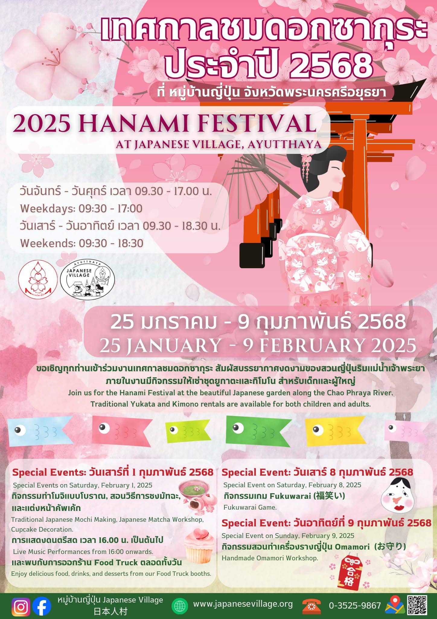 ททท. สำนักงานพระนครศรีอยุธยา เชิญชวนเข้าร่วมงานเทศกาลชมดอกซากุระ 2568 สัมผัสบรรยากาศงดงามของสวนญี่ปุ่นริมแม่น้ำเจ้าพระยา วันที่ 25 มกราคม – 9 กุมภาพันธ์ 2568 ณ หมู่บ้านญี่ปุ่น จังหวัดพระนครศรีอยุธยา
