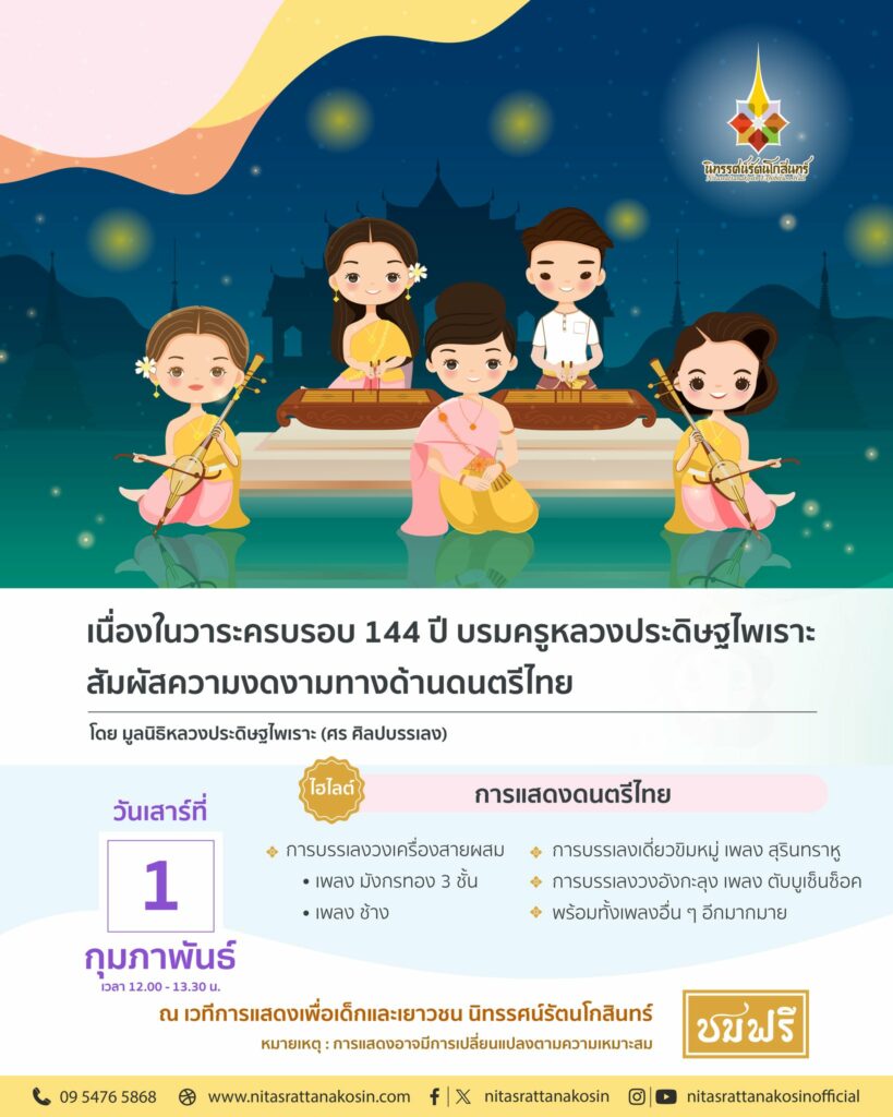 นิทรรศน์รัตนโกสินทร์ จัดเวทีการแสดงเพื่อเด็กและเยาวชน วันเสาร์ที่ 1 กุมภาพันธ์ 2568 เนื่องในวาระครบรอบ 144 ปี บรมครูหลวงประดิษฐไพเราะ สัมผัสความงดงามทางด้านดนตรีไทย โดย มูลนิธิหลวงประดิษฐไพเราะ (ศร ศิลปบรรเลง)