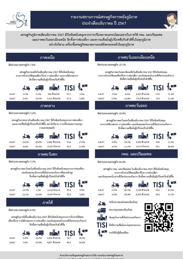 เศรษฐกิจภูมิภาคเดือนธันวาคม 2567 มีปัจจัยสนับสนุนจากการบริโภคภาคเอกชน โดยเฉพาะในภาคใต้ กทม. และปริมณฑล และภาคตะวันออกเฉียงเหนือ อีกทั้งการท่องเที่ยว และความเชื่อมั่นผู้บริโภคที่ปรับตัวดีขึ้นในทุกภูมิภาค อย่างไรก็ตาม เครื่องชี้เศรษฐกิจหมวดยานยนต์ยังคงชะลอตัวในทุกภูมิภาค