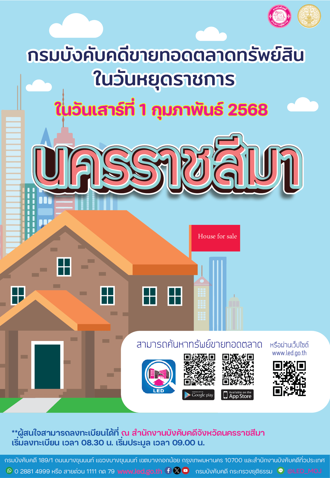 กรมบังคับคดี จัดขายทอดตลาดทรัพย์สินในวันหยุดราชการ จังหวัดนครราชสีมา ในวันเสาร์ที่ 1 กุมภาพันธ์ 2568 เริ่มลงทะเบียน เวลา 8.30 น. เริ่มประมูล เวลา 09.00 น. สามารถตรวจดูรายการทรัพย์สินได้ทาง www.led.go.th และทาง Application LED Property ผู้สนใจสามารถลงทะเบียนได้ที่ สำนักงานบังคับคดีจังหวัดนครราชสีมา