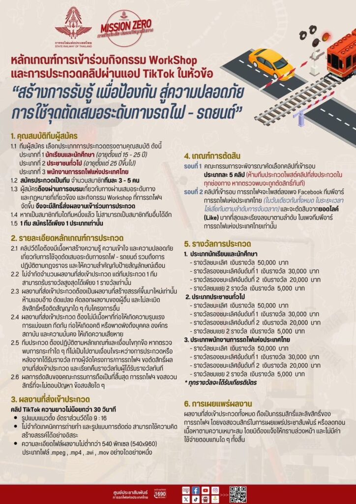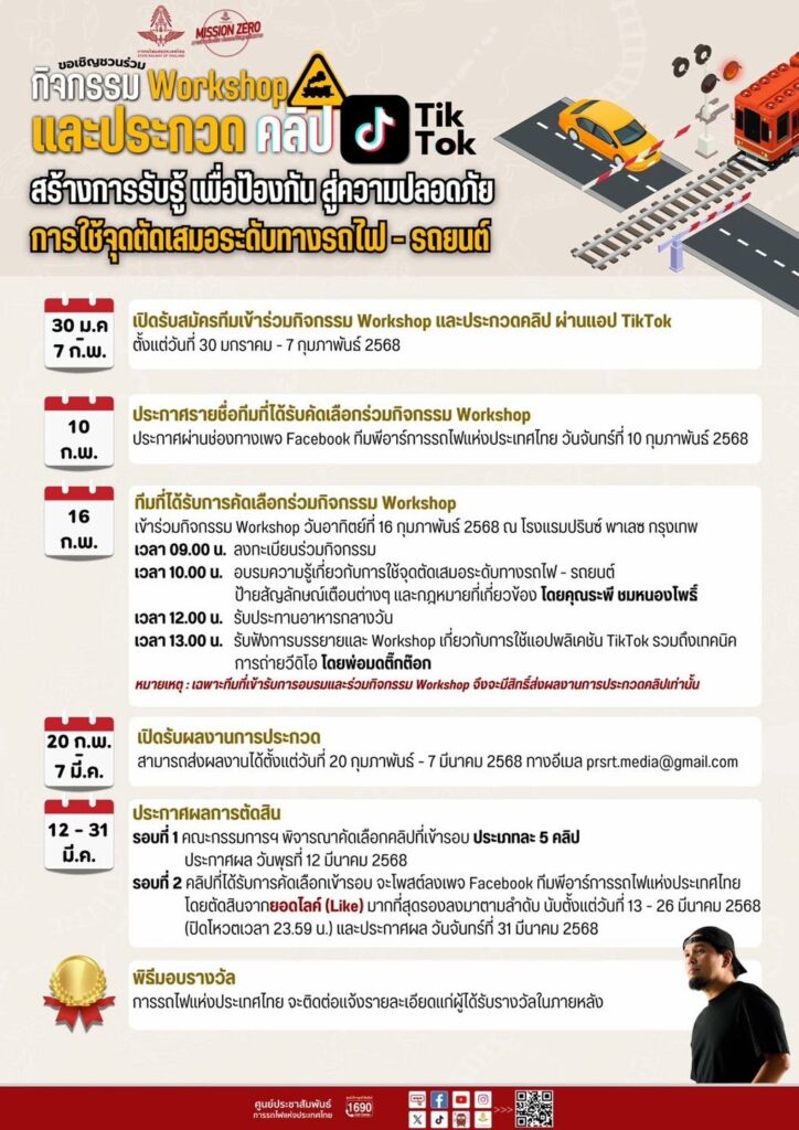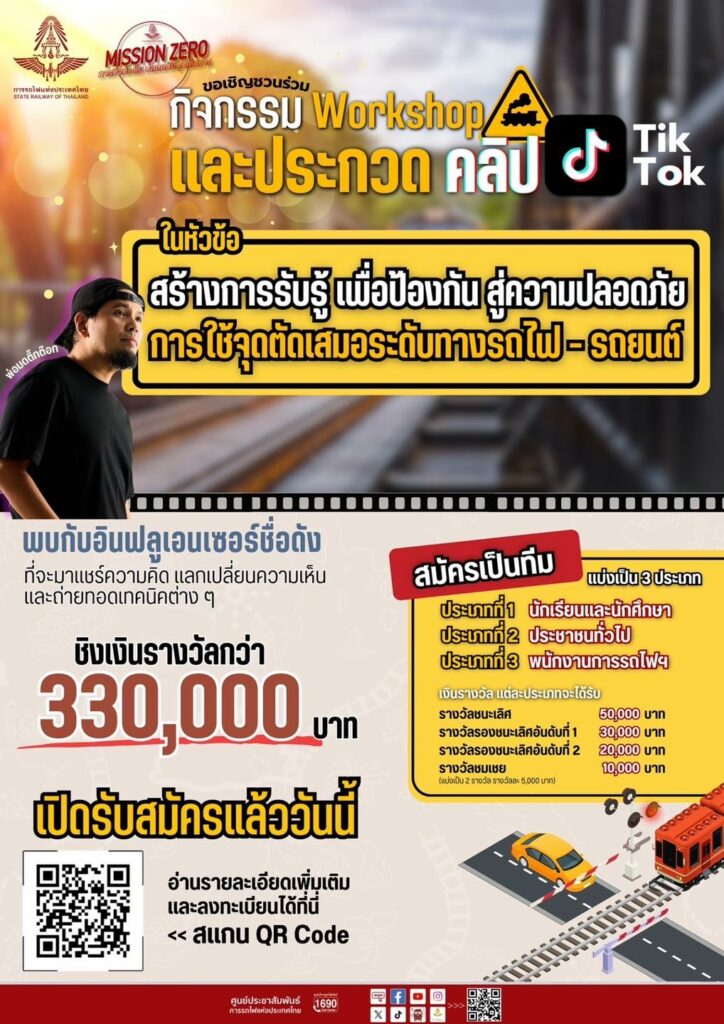 การรถไฟแห่งประเทศไทย ขอเชิญชวนร่วมกิจกรรม Workshop และประกวดคลิป TikTok ในหัวข้อ สร้างการรับรู้ เพื่อป้องกัน สู่ความปลอดภัย การใช้จุดตัดเสมอระดับทางรถไฟ – รถยนต์ ชิงเงินรางวัลรวมมูลค่ากว่า 330,000 บาท เปิดรับสมัครตั้งแต่วันนี้ – 7 กุมภาพันธ์ 2568 ร่วมกิจกรรม WORKSHOP พบกับอินฟลูเอนเซอร์ชื่อดัง อาทิ คุณศิลา พีรวัฑฒึก เจ้าของช่อง “พ่อมดติ๊กต๊อก” ที่จะมาถ่ายทอดและแบ่งปันเทคนิคการถ่ายวิดีโอให้น่าสนใจ นอกจากนี้ ยังมีเจ้าหน้าที่ผู้เชี่ยวชาญจากการรถไฟฯ มาร่วมให้ความรู้เกี่ยวกับการใช้จุดตัดเสมอระดับทางรถไฟ – รถยนต์ ป้ายสัญญาณต่างๆ และกฎหมายที่เกี่ยวข้อง