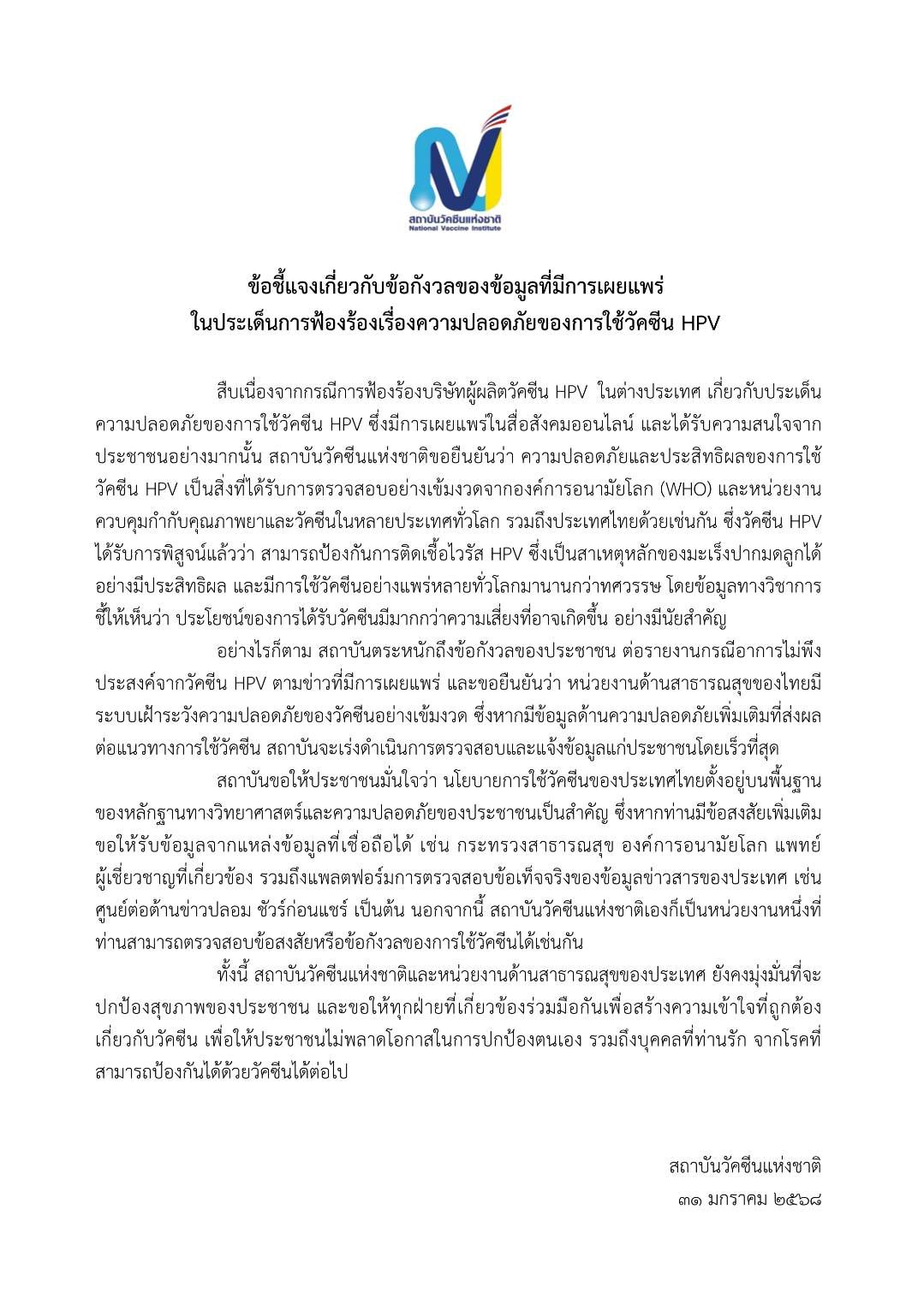 อย่างไรก็ตาม สถาบันตระหนักถึงข้อกังวลของประชาชน ต่อรายงานกรณีอาการไม่พึง ประสงค์จากวัคซีน HPV ตามข่าวที่มีการเผยแพร่ และขอยืนยันว่า หน่วยงานด้านสาธารณสุขของไทยมี ระบบเฝ้าระวังความปลอดภัยของวัคซีนอย่างเข้มงวด ซึ่งหากมีข้อมูลด้านความปลอดภัยเพิ่มเติมที่ส่งผล