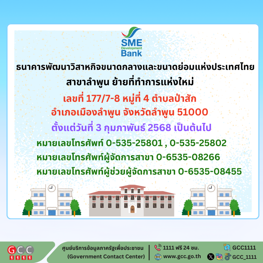 ธนาคารพัฒนาวิสาหกิจขนาดกลางและขนาดย่อมแห่งประเทศไทย (ธพว.) หรือ SME D  Bank สาขาลำพูน  ขอแจ้งย้ายที่ทำการสาขาแห่งใหม่ จากที่เดิมไปตั้งอยู่ ณ  177/7-8 หมู่ที่ 4 ต.ป่าสัก อ.เมืองลำพูน จ.ลำพูน 51000 ตั้งแต่วันที่ 3 กุมภาพันธ์ 2568 เป็นต้นไป  โดยที่ตั้งสาขาใหม่ดังกล่าว เป็นทำเลอยู่ใจกลางเมือง มีพื้นที่ให้บริการกว้างขวาง  สามารถอำนวยความสะดวกแก่ลูกค้าผู้ประกอบการเอสเอ็มอีที่มาติดต่อและใช้บริการได้เป็นอย่างดี สอบถามรายละเอียดเพิ่มเติม โทร.053-525-801 , 053-525-802 , 065-350-8266 , 065-350-8455  หรือ  Call Center 1357