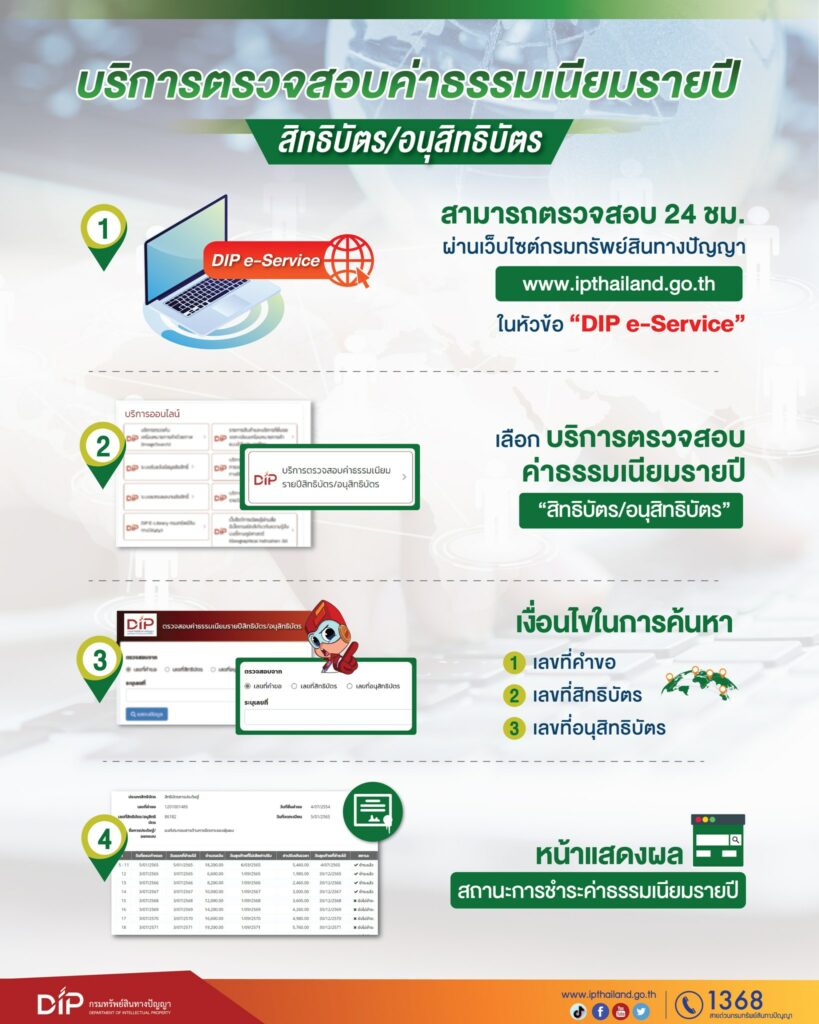 กรมทรัพย์สินทางปัญญา แนะนำบริการตรวจสอบค่าธรรมเนียมรายปี สิทธิบัตร/อนุสิทธิบัตร