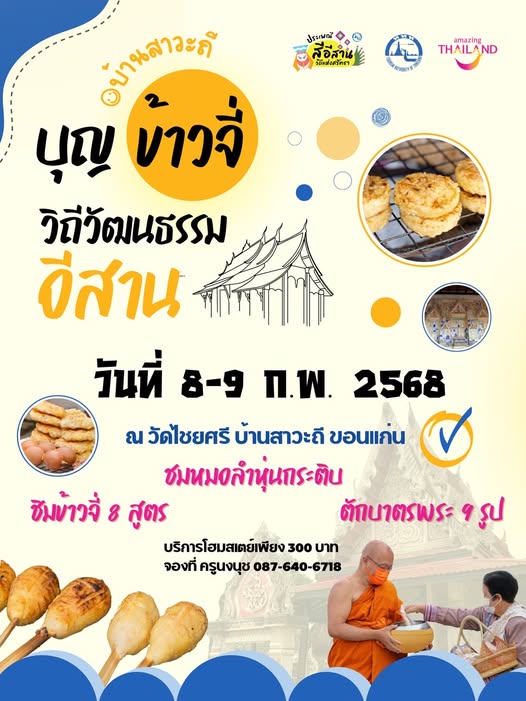 ชวนทุกคนไปสัมผัสวัฒนธรรมอีสานที่งาน “บุญข้าวจี่วิถีอีสาน” จ.ขอนแก่น วันที่ 8 – 9 กุมภาพันธ์ 2568 ณ วัดไชยศรี บ้านสาวะถี ต.สาวะถี อ.เมือง จ.ขอนแก่น