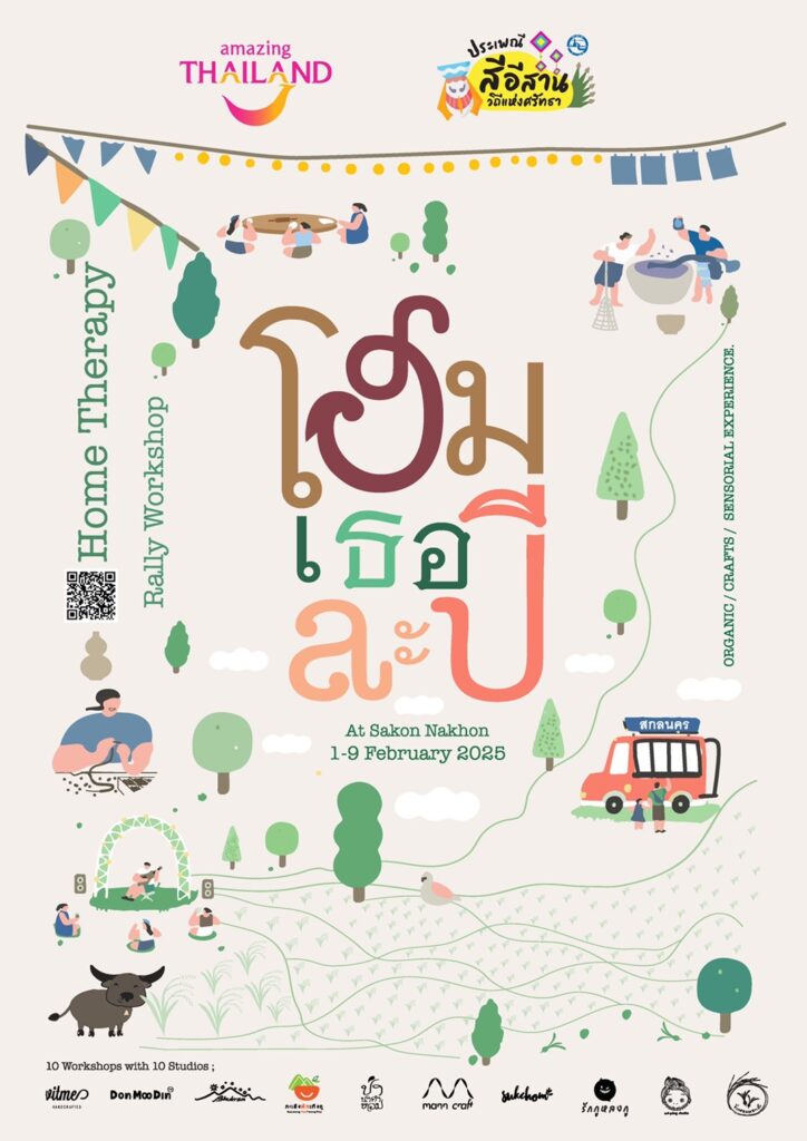 กิจกรรม “โฮมเธอละปีแรลลี่เวิร์กชอป” (Home Therapy Rally Workshop) เกิดจากการบูรณาการความร่วมมือระหว่าง ททท. ร่วมกับ กลุ่มโฮมเธอละปี โดย 10 กลุ่มผู้ประกอบการคนรุ่นใหม่ในจังหวัดสกลนครที่มีความสนใจในด้านศิลปะ หัตถกรรม ตลอดจนมีความตื่นตัวและเล็งเห็นถึงคุณค่าของภูมิปัญญาและวิถีของชุมชน ซึ่งมารวมตัวกันเพื่อสืบสานภูมิปัญญาท้องถิ่นในจังหวัดสกลนคร และเชื่อมโยงการมีส่วนร่วมระหว่างการท่องเที่ยวกับชุมชนไว้ด้วยกัน ประกอบด้วย 1. Vitme Handcraft Studio 2. ดอนหมูดิน Donmoodin บ้านช่างปั้น 3. ภูคราม: Bhukram 4. กะเลิง ผัก เทิงภู 5. ป่านาคำหอม: Pa Na Come Home 6. Mann Craft 7. สุขชม: SukChom 8. รักกูหลงกู Home Breaded 9. อาร์ตเพลย์ สตูดิโอ: Art-play studio และ 10. ข้าวหอมดอกฮัง: HomDoKHung Rice โดยจัดกิจกรรมในรูปแบบแรลลี่เวิร์กชอปให้แก่นักท่องเที่ยวที่เดินทางมายังจังหวัดสกลนคร โดยนักท่องเที่ยวสามารถเลือกเข้าร่วมกิจกรรมตามความสนใจ และสำหรับนักท่องเที่ยวที่ต้องการเข้าร่วมการเวิร์กชอปทั้ง 10 แห่ง สามารถแจ้งความประสงค์ลงทะเบียนรับพาสปอร์ต (Passport Rally Workshop) ได้ที่ Facebook Page : Home Therapy Rally Workshop at Sakonnakhon หรือ ติดต่อโดยตรงกับผู้ประกอบการทั้ง 10 แห่ง เพื่อเก็บสะสมแสตมป์ให้ครบ 10 จุด ได้สิทธิ์ลุ้นรับของที่ระลึกสุดพรีเมี่ยม Limited Edition จากทั้ง 10 กลุ่ม โดยจะคัดเลือกผู้โชคดี 20 ท่าน ที่ทำการสะสมแสตมป์ในพาสปอร์ตครบ 10 แห่ง ด้วยการจับฉลากและประกาศรายชื่อผู้โชคดีที่ได้รับของที่ระลึกในวันที่ 10 กุมภาพันธ์ 2568 ผ่าน Facebook Page : Home Therapy Rally Workshop at Sakonnakhon