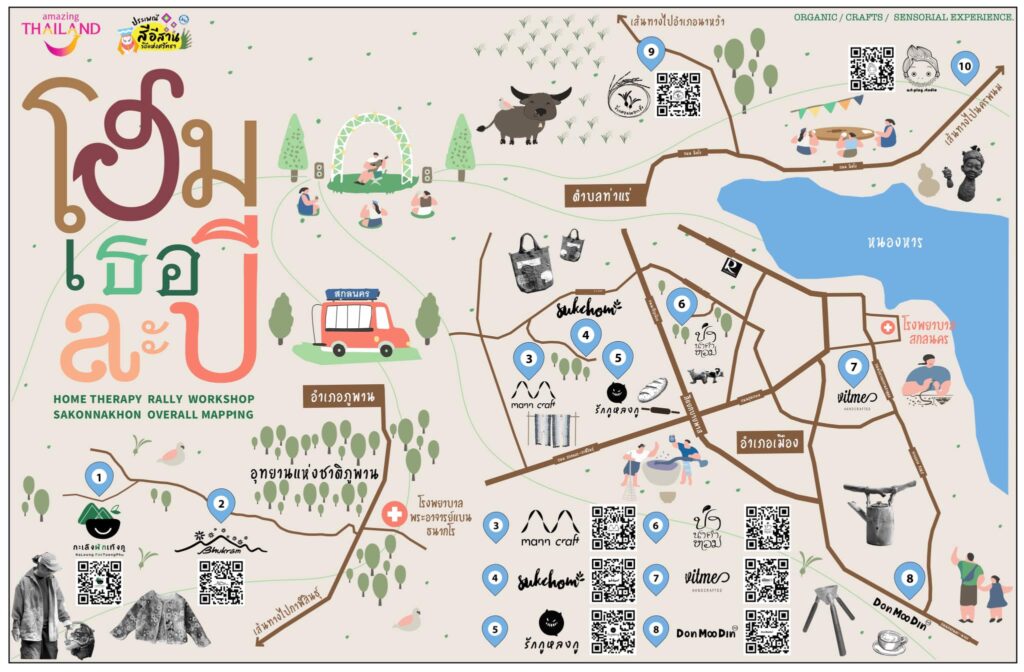 ทั้งนี้ นักท่องเที่ยวที่สนใจเข้าร่วมกิจกรรม“โฮมเธอละปีแรลลี่เวิร์กชอป” (Home Therapy Rally Workshop) ททท. แนะนำการเดินทาง 3 เส้นทาง ดังต่อไปนี้ เส้นทางที่ 1 อำเภอเมือง-ภูพาน : Vitme Handcraft Studio > ดอนหมูดิน Donmoodin บ้านช่างปั้น > ภูคราม: Bhukram > กะเลิง ผัก เทิงภู เส้นทางที่ 2 ตำบลบ้านหนองแดง-บ้านหนองยาง: ป่านาคำหอม: Pa Na Come Home > Mann Craft > สุขชม: SukChom > รักกูหลงกู Home Breaded เส้นทางที่ 3 อำเภอกุสุมาลย์ -บ้านโคกสะอาด: อาร์ตเพลย์ สตูดิโอ: Art-play studio > ข้าวหอมดอกฮัง: HomDoKHung Rice ผู้ที่สนใจสามารถติดตามข้อมูลกิจกรรมและสอบถามรายละเอียดเพิ่มเติมได้ที่ Facebook Page : Home Therapy Rally Workshop at Sakonnakhon หรือ โทร. 1672 Travel Buddy