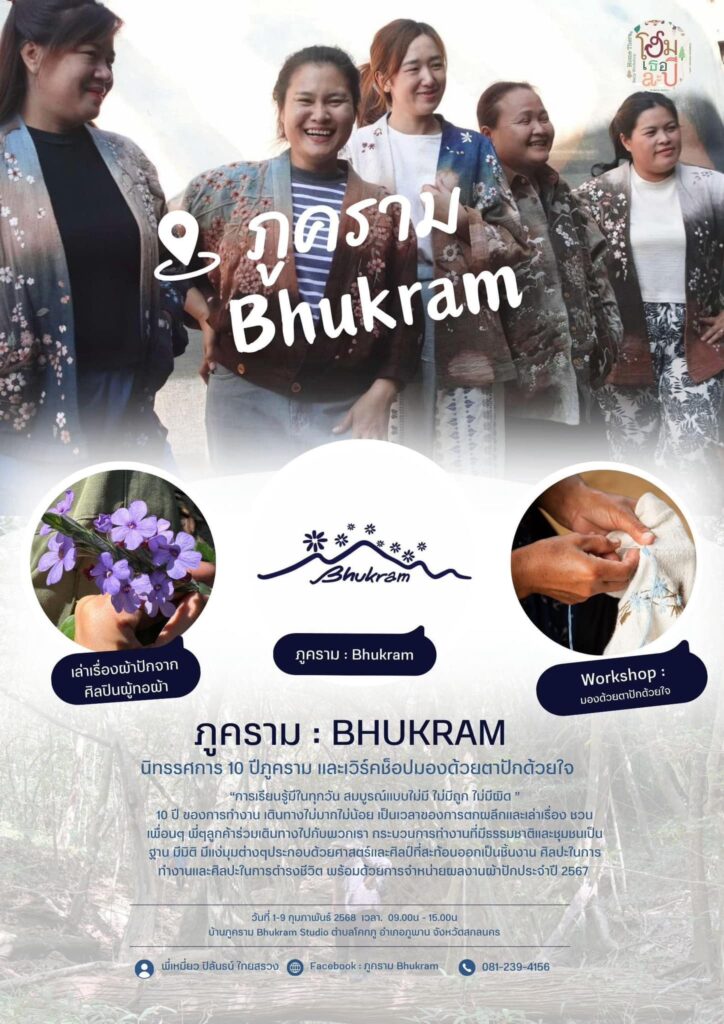 จัดแสดงผลงานนิทรรศการ 10 ปีภูคราม“Bhukram in 10 years” 10 ปีของการทำงาน เดินทางไม่มากไม่น้อย เป็นเวลาของการตกผลึกและเล่าเรื่อง ชวนทุกคนร่วมเดินทางไปสัมผัสกระบวนการทำงานที่มีธรรมชาติและชุมชนเป็นฐาน มีมิติ มีแง่มุมต่างๆประกอบด้วยศาสตร์และศิลป์ที่สะท้อนออกเป็นชิ้นงาน ศิลปะในการทำงานและศิลปะในการดำรงชีวิต “การเรียนรู้มีในทุกวัน สมบูรณ์แบบไม่มี ไม่มีถูก ไม่มีผิด”