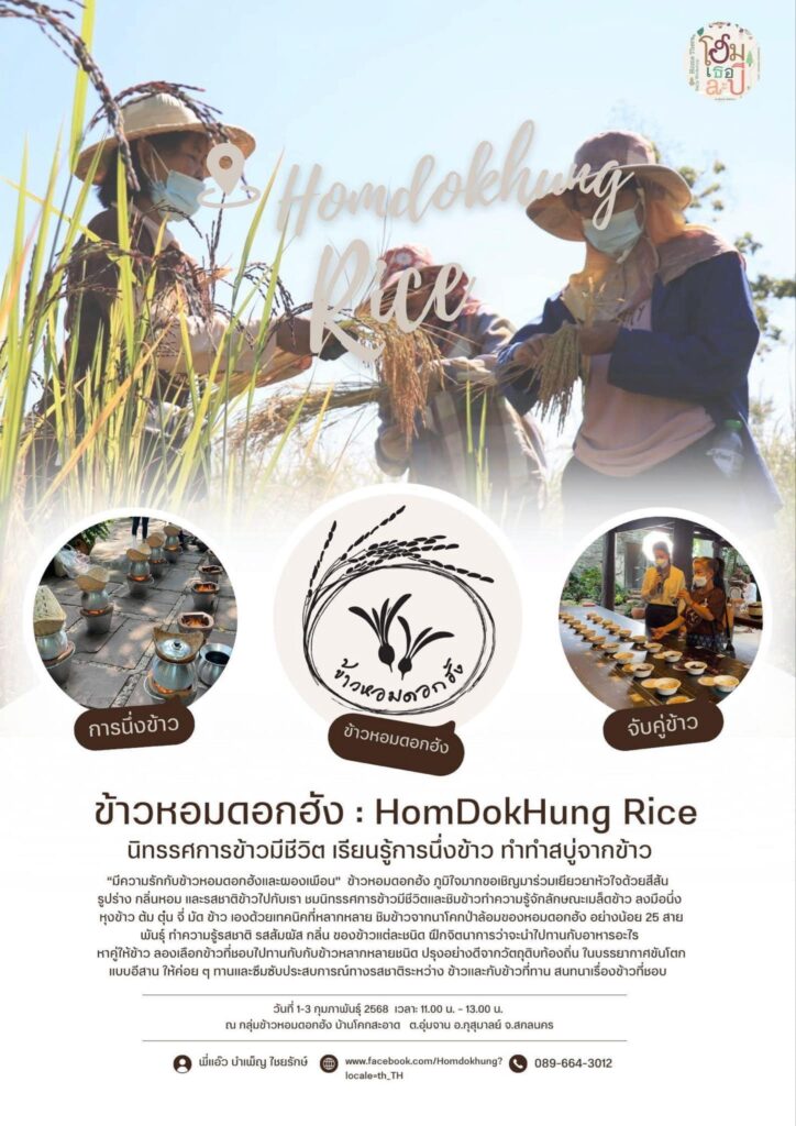 - ช่องทางการติดต่อ : Facebook Page : ข้าวหอมดอกฮัง : Homdokhung Rice หรือ โทร. 089 664 3012 (คุณบำเพ็ญ ไชยรักษ์)